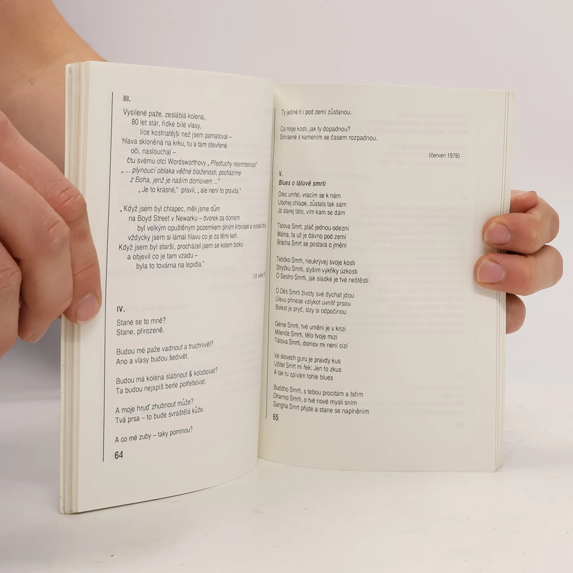 Ze sbírek Collected Poems 1947-1980, White Shroud, Poems 1980-1985 a časopiseckých vydání uspořádal převážně sám A. Ginsberg za své návštěvy v Praze roku 1990. Ediční poznámka Cílem tohoto výboru z Ginsbergovy poezie bylo navázat na souborné vydání ginsbergovských překladů Jana Zábrany (Kvílení, Odeon 1990), jež je ohraničeno lety 1950 – 1965, a pokusit se tak doplnit a ucelit obraz díla tohoto předního představitele americké beat generation. Doporučující výbor ze svého díla provedl při své poslední návštěvě v Praze (v dubnu 1990) sám autor; jeho výbor byl sice (především z důvodů rozsahu textů) zkrácen, avšak zároveň byl i (především z důvodů možností překladu a předpokládané srozumitelnosti českému čtenáři) rozšířen o několik dalších básnických textů z let 1965 – 1985, a také o pár čísel z pětiletí následujícího, tj. z posledního období básníkovy tvorby. Výbor je symbolicky ukončen loňským Návratem krále Majáles. Při uspořádání výboru jsme také přihlíželi ke studii Protestní, prorocké a elegické zpěvy Allena Ginsberga od prof. Josefa Jařaba (otištěné v odeonském svazku Kvílení), která pojednává i o posledních desítiletích básníkovy tvorby a která nám pomohla se v básníkově rozsáhlém díle zorientovat. Martin Machovec leden 1991