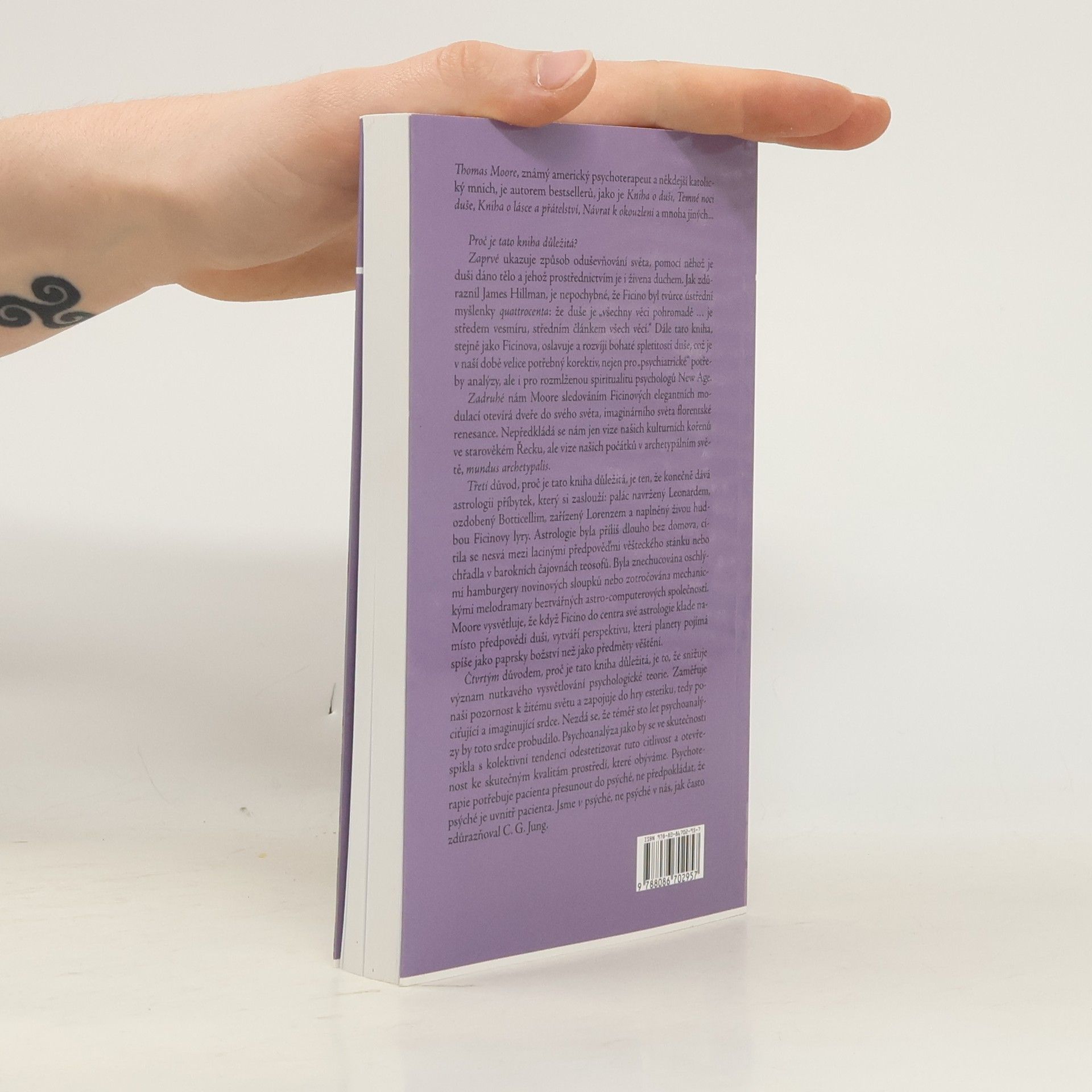 Podtitul: Astrologická psychologie Marsilia Ficina Thomas Moore, známý americký psychoterapeut, někdejší katolický mnich a autor bestsellerů jako je Kniha o duši, Temné noci duše, Kniha o lásce a přátelství, Návrat k okouzlení a mnoha jiných v této knize sledováním Ficinových psychologických a astrologických myšlenek otevírá dveře do světa florentské renesance. Nepředkládá se nám jen vize našich kulturních kořenů ve starověkém Řecku, ale vize našich počátků v archetypálním světě, mundus archetypalis. Jak zdůraznil James Hillman, je nepochybné, že Ficino byl tvůrce ústřední myšlenky quattrocenta: že duše je „všechny věci pohromadě … je středem vesmíru, středním článkem všech věcí.“ Dále tato kniha, stejně jako Ficinova, oslavuje a rozvíjí bohaté spletitosti duše, což je v naší době velice potřebný korektiv, nejen pro „psychiatrické“ potřeby analýzy, ale i pro rozmlženou spiritualitu psychologů New Age.