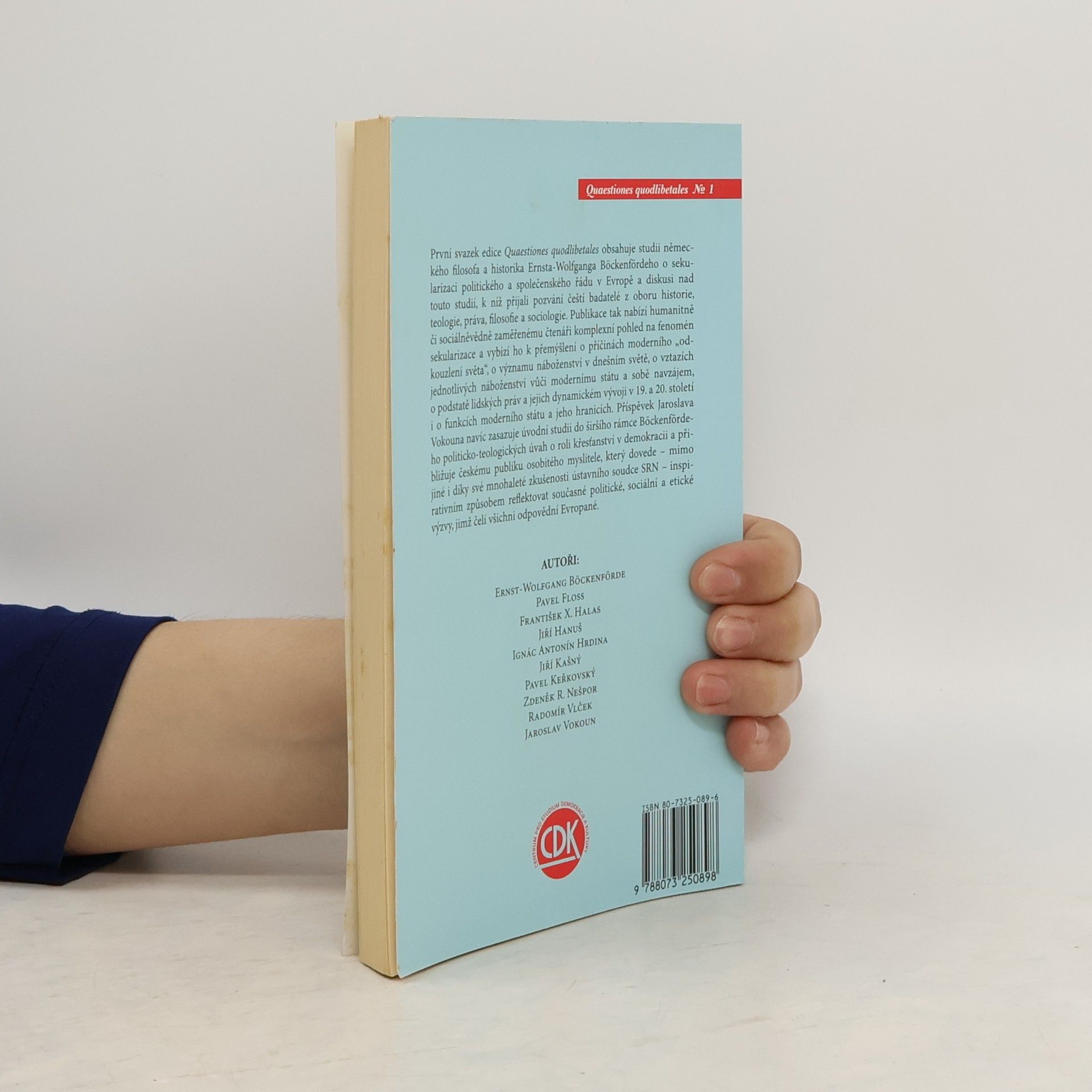 První svazek edice Quaestiones quodlibetales obsahuje studii německého filosofa a historika Ernsta-Wolfganga Böckenfördeho o sekularizaci politického a společenského řádu v Evropě a diskusi nad touto studií, k níž přijali pozvání čeští badatelé z oboru historie, teologie, práva, filosofie a sociologie. Publikace tak nabízí humanitně či sociálněvědně zaměřenému čtenáři komplexní pohled na fenomén sekularizace a vybízí ho k přemýšlení o příčinách moderního "odkouzlení světa", o významu náboženství v dnešním světě, o vztazích jednotlivých náboženství vůči modernímu státu a sobě navzájem, o podstatě lidských práv a jejich dynamickém vývoji v 19. a 20. století i o funkcích moderního státu a jeho hranicích. Příspěvek Jaroslava Vokouna navíc zasazuje úvodní studii do širšího rámce Böckenfördeho politicko-teologických úvah o roli křesťanství v demokracii a přibližuje českému publiku osobitého myslitele, který dovede mimo jiné i díky své mnohaleté zkušenosti ústavního soudce SRN inspirativním způsobem reflektovat současné politické, sociální a etické výzvy, jimž čelí všichni odpovědní Evropané.