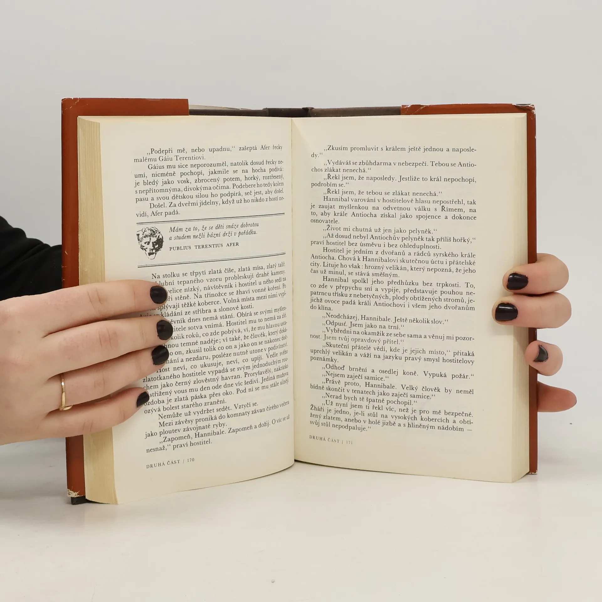 Román z prostředí starého Říma v období mezi druhou a třetí punskou válkou. Hlavním hrdinou románu je Publius Terentius Afer, jehož komedie, psané podle řeckých vzorů, ovlivnily spolu s díly Pautovými a Aristofanovými vývoj světového dramatického umění. V útlém dětství byl spolu se synky nejbohatších rodin Kartága poslán vítězným Římanům darem jako otrok a jeho jediným štěstím bylo, že si jej vybral senátor Terentius Lucanus, jenž nejen že mu umožnil stejné vzdělání jako vlastnímu synovi, ale před smrtí jej propustil na svobodu. Život v domě Scipionově v kruhu nejvzdělanějších mužů Říma pak ještě více vytříbil chlapcův talent, takže z malého kartáginského otroka vyrostl nakonec jeden z nejslavnějších autorů římských komedií, píšící elegantní a vzornou latinou. (nakladatel)