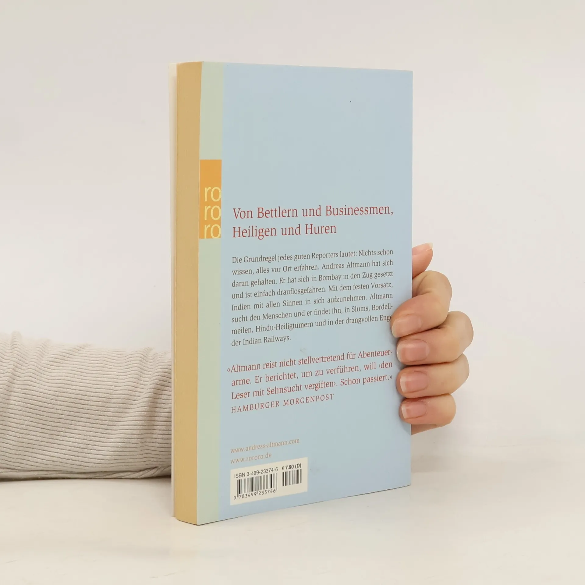 Von Bettlern und Businessmen, Heiligen und HurenDie Grundregel jedes guten Reporters lautet: Nichts schon wissen, alles vor Ort erfahren. Andreas Altmann hat sich daran gehalten. Er hat sich in Bombay in den Zug gesetzt und ist einfach drauflos gefahren. Mit dem festen Vorsatz, Indien mit allen Sinnen in sich aufzunehmen. Altmann sucht den Menschen und er findet ihn, in Slums, Bordellmeilen, Hindu-Heiligtümern und in der drangvollen Enge der Indian Railways.