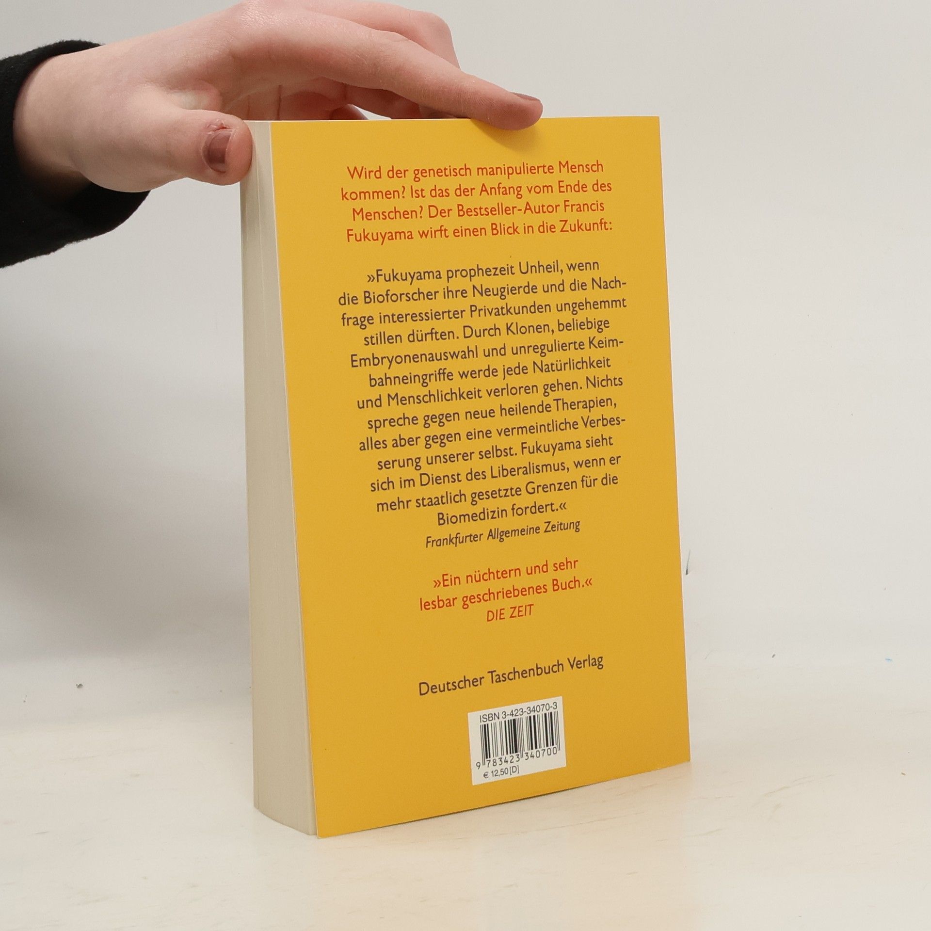 Im Zeitalter des Klonbabys wichtiger denn je: ein Plädoyer für die wirksame Kontrolle der Biotechnologie Vielleicht werden wir bald alle über 100 Jahre alt, und vielleicht können wir in nächster Zukunft unsere Kinder nach unseren Wünschen genetisch maßschneidern – doch welchen Preis hat diese schöne neue Welt? Bezahlen wir den rasanten Fortschritt der Biotechnologie mit dem Verlust der Menschlichkeit? Anschaulich und präzise beschreibt Francis Fukuyama die wissenschaftlichen Erkenntnisse und zukünftigen Möglichkeiten, warnt eindringlich vor den Konsequenzen, verteidigt leidenschaftlich die Menschenrechte und die Menschenwürde und mahnt die politisch Handelnden eindringlich zu nationaler und internationaler Kontrolle der Biotechniken.