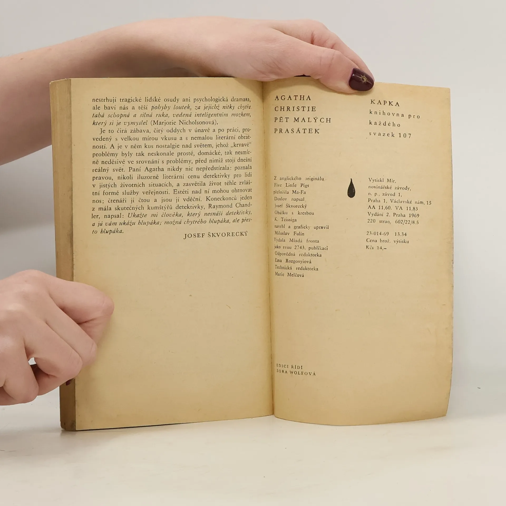 Lucy Craleová přišla ve svých sedmi letech o matku Carolinu, která byla odsouzena za vraždu svého manžela Amyase, Lucyina otce. Po čtrnácti letech dostává Lucy dědictví jehož součástí je i dopis, který jí matka napsala před svou smrtí a v němž tvrdí, že je nevinná. Lucy se rozhodne očistit její jméno a požádá slavného detektiva Hercule Poirota o prošetření případu. Poirot případ přijímá a nejprve jde za advokátem, který před čtrnácti lety Carolinu obhajoval. Od něj se mimo jiné dozví, že Amyas míval pletky se ženami, což Caroline mlčky snášela,. Až na tu poslední, Elsu Greerovou... Doslov Josef Škvorecký.