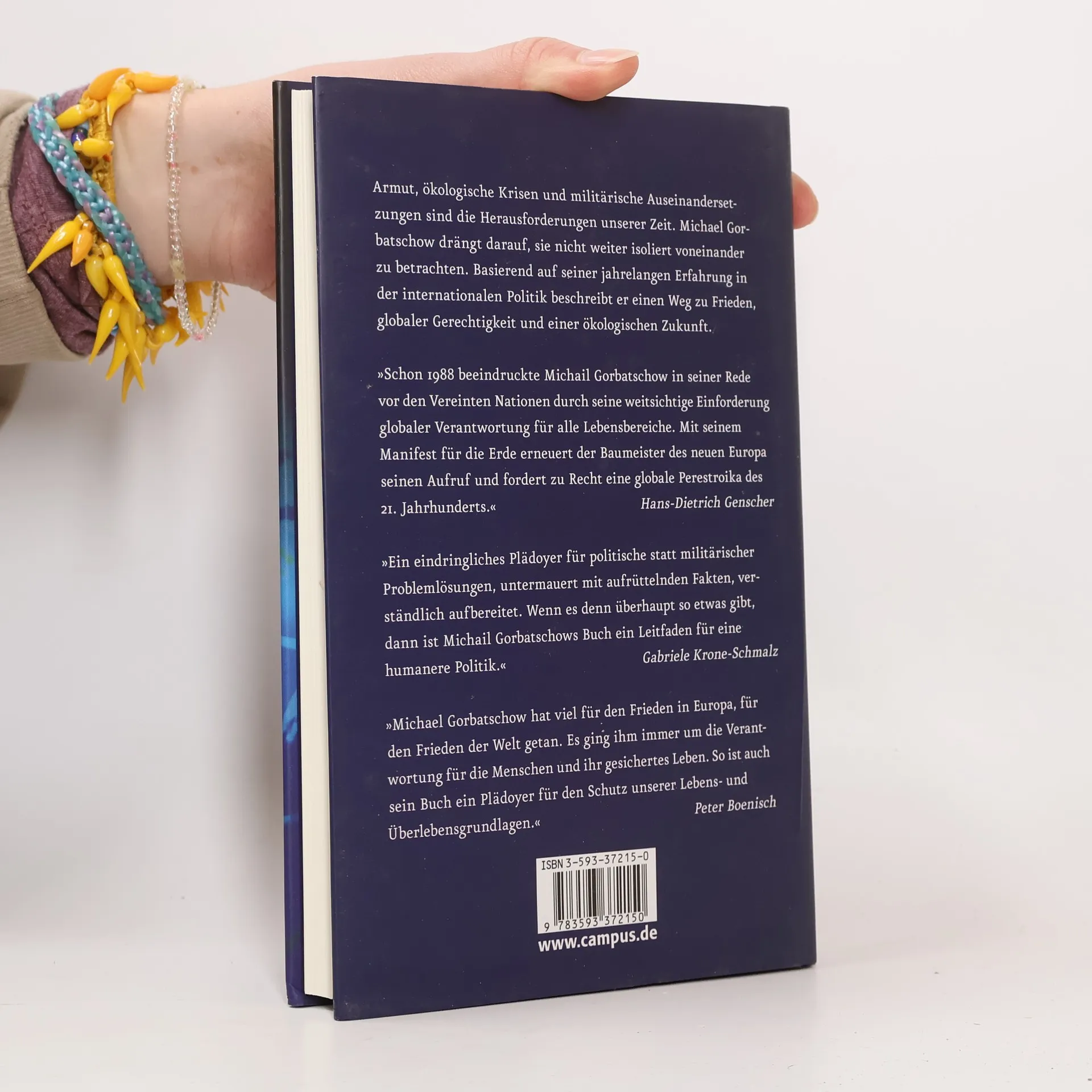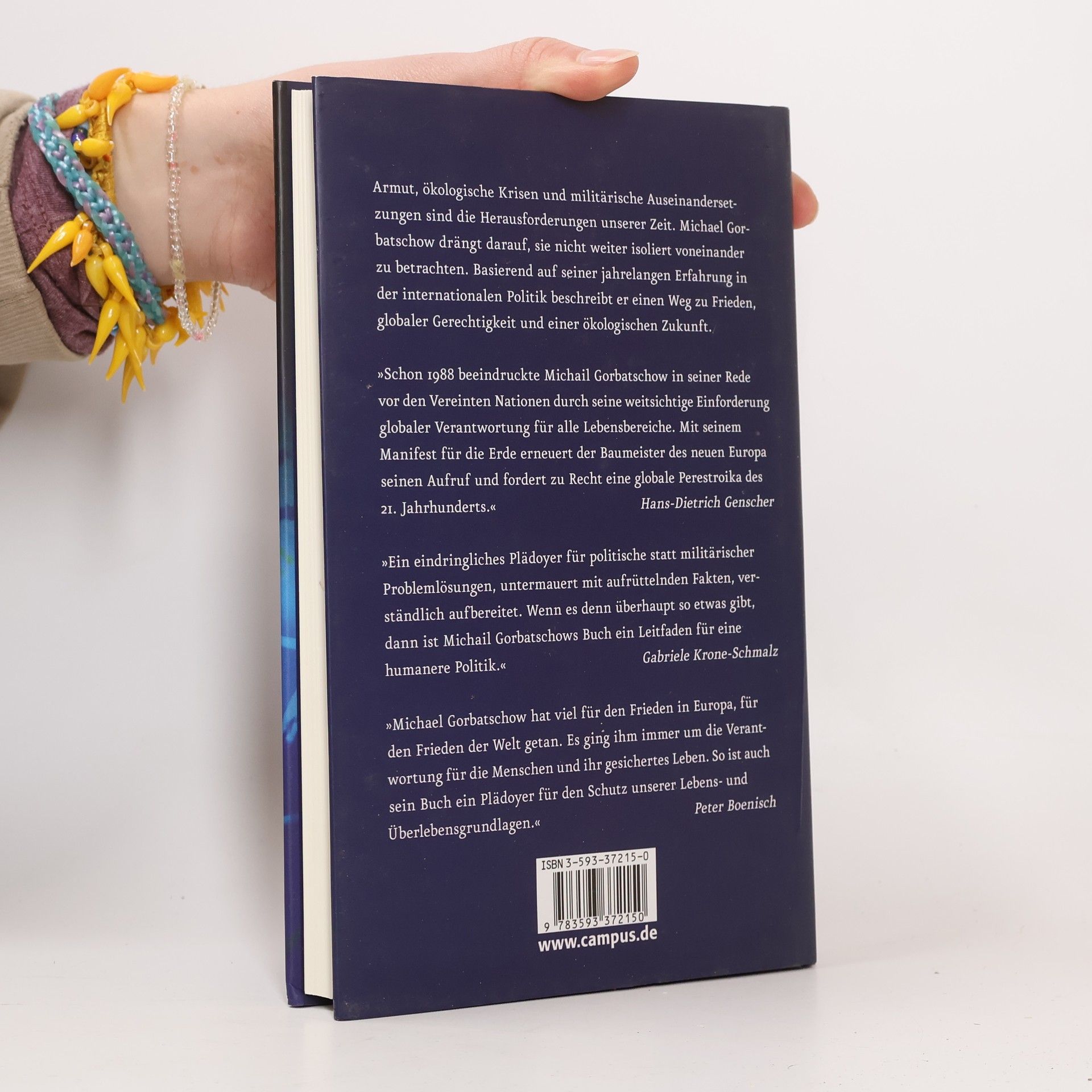 Gorbatschow steht für Demokratisierung und Abrüstung, er beendete den Kalten Krieg. Doch nach dem Zusammenbruch der Sowjetunion ist die Chance vertan worden, eine friedliche Weltordnung zu schaffen, in der Menschenrechte und internationales Recht anerkannt, Ressourcen geschont und die Grundbedürfnisse aller Menschen befriedigt werden. Die Ungleichheit in der Welt ist die Ursache für die heutigen internationalen Konflikte, die es zu bekämpfen gilt. Seit mehr als einem Jahrzehnt widmet er sein Engagement dem Schutz der Erde. Er gründete die Organisation „Green Cross International“, die sich in über 30 Ländern für Frieden, Umwelt und Gerechtigkeit einsetzt. In seinem Buch fordert er die Stärkung der UNO und Reformen von Weltbank, Welthandelsorganisation und dem IWF. Neben die Menschenrechts-Deklaration und die UN-Charta setzt er eine ökologisch ausgerichtete „Erd-Charta“, denn die Umweltpolitik wird in Zukunft der wichtigste Teil der Weltpolitik sein.