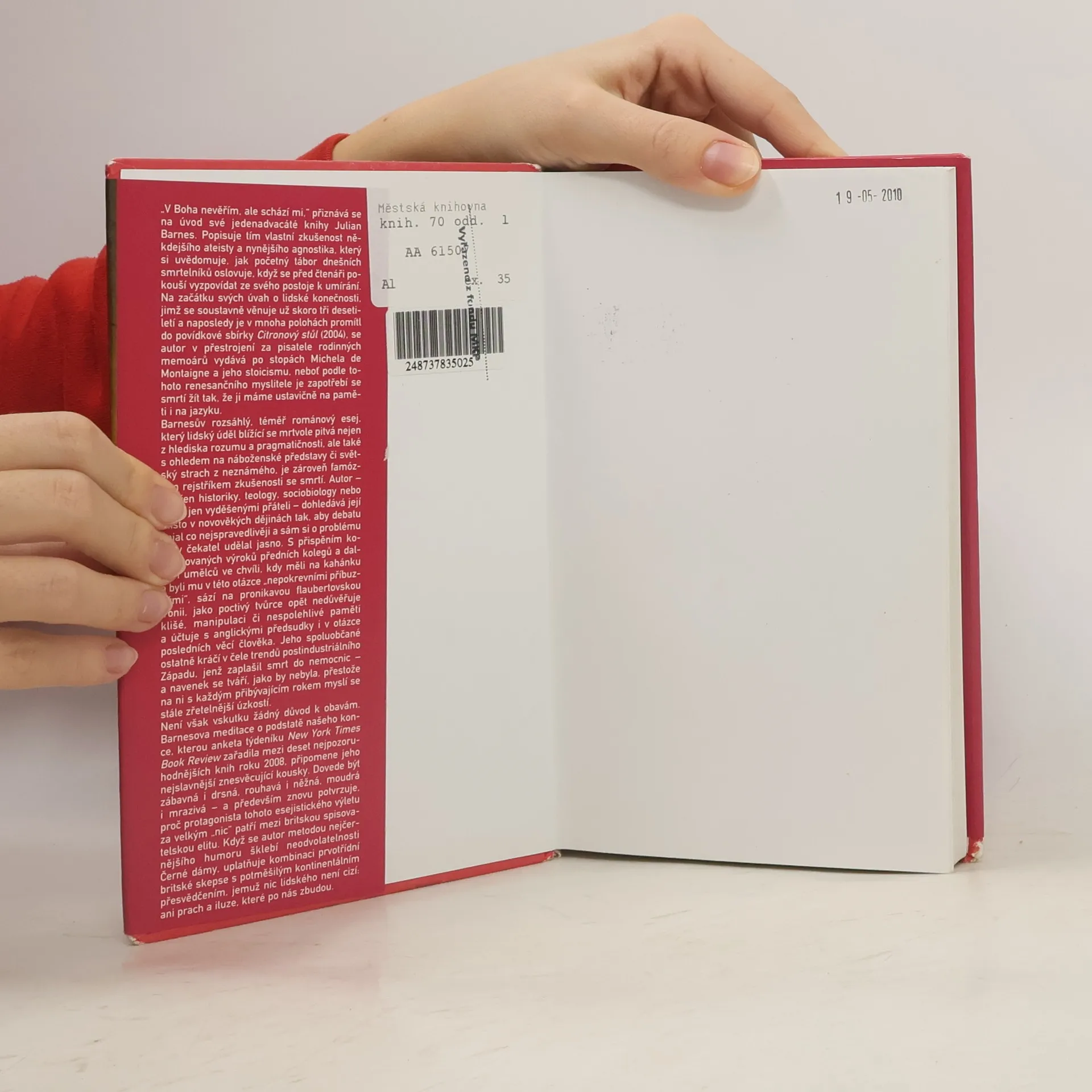V boha nevěřím, ale někdy mi schází, přiznává se na úvod svého jedenáctého románu Julian Barnes. Shrnuje tím vlastní zkušenost někdejšího ateisty a nynějšího agnostika, který si uvědomuje, za jak početný tábor příslušníků sekularizované éry promlouvá, když se před čtenáři zpovídá ze svého strachu z umírání a ze smrti. Jeho nejnovější meditace na téma lidské konečnosti má podobu rozsáhlého románového eseje rozebírajícího téma z hlediska rozumu a pragmatičnosti, ale připouštějícího si i tabuizovanou hrůzu z neznámého. Román je zároveň obřím a famózním rejstříkem lidské zkušenosti se smrtí, jejíž místo v novověkých dějinách hledá a dokládá na příkladech ze sklonku života předních spisovatelů a dalších veřejných činitelů. Není však vskutku žádný důvod k obavám: autor při tom dovede být zábavný i něžný, moudrý i mrazivý, předvádí bytostné frankofilství a účtuje s ostrovními předsudky. Jeho příspěvek o podstatě našeho konce znovu potvrzuje, proč autor patří k nejlepším anglickým stylistům.