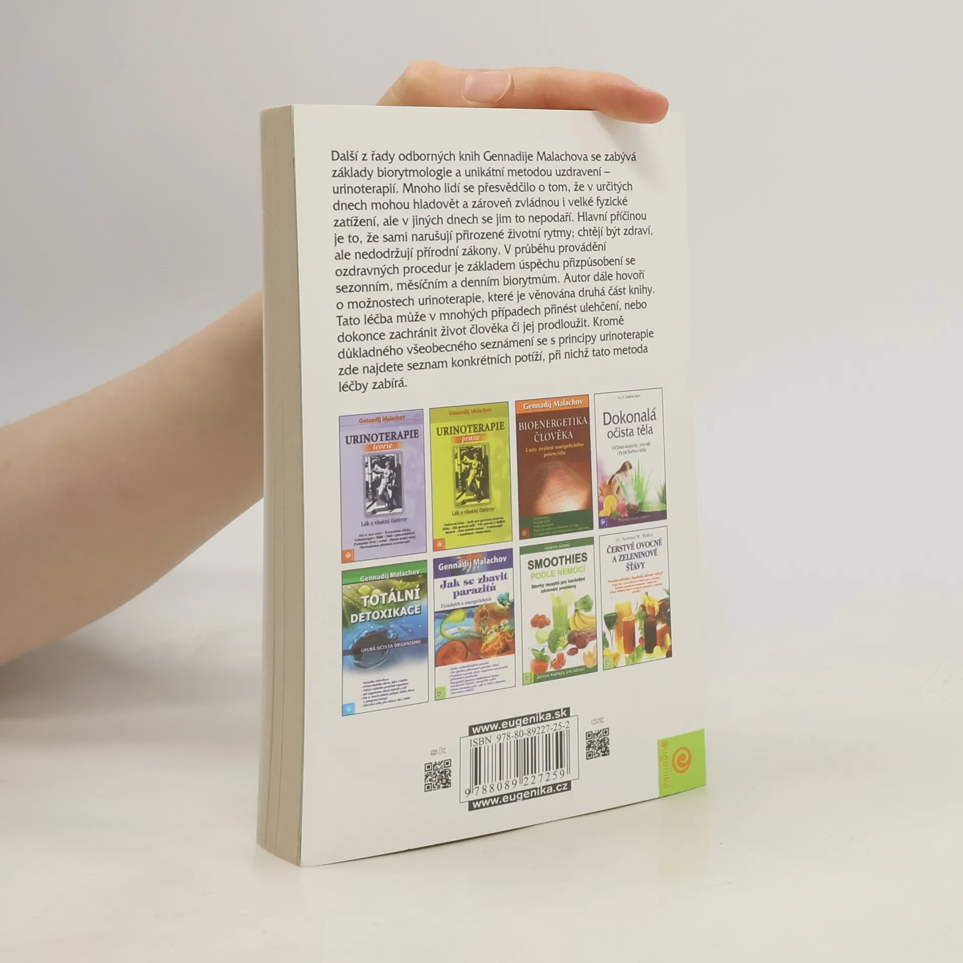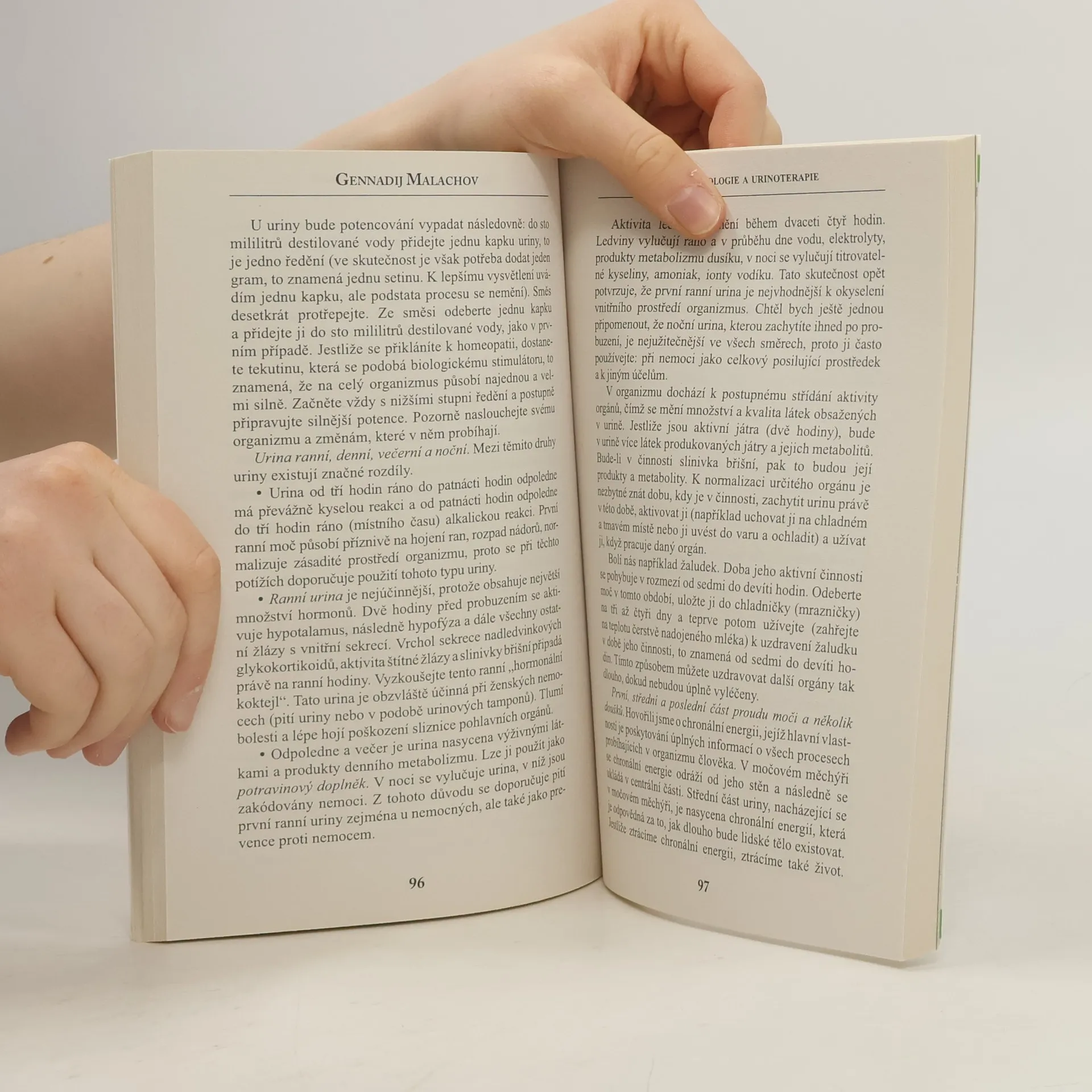 Tato kniha se zabývá základy biorytmologie a unikátní metodou uzdravení - urinoterapií. Mnoho lidí se přesvědčilo o tom, že v určitých dnech mohou hladovět a zároveň zvládnou i velké fyzické zatížení, ale v jiných dnech se jim to nepodaří. V průběhu provádění ozdravných procedur je základem úspěchu přizpůsobení se sezonním, měsíčním a denním biorytmům. Autor dále hovoří o možnostech urinoterapie, které je věnována druhá část knihy. Kromě důkladného všeobecného seznámení se s principy urinoterapie zde najdete seznam konkrétních potíží, při nichž tato metoda léčby zabýrá. Publikace: Urinoterapie a biorytmologie - Gennadij Malachov. Další z řady odborných knih Gennadije Malachova se zabývá základy biorytmologie a unikátní metodou uzdravení - urinoterapií.Kromě důkladného všeobecného seznámení se s principy urinoterapie zde najdete seznam konkrétních potíží, při nichž tato metoda metoda léčby zabíra.