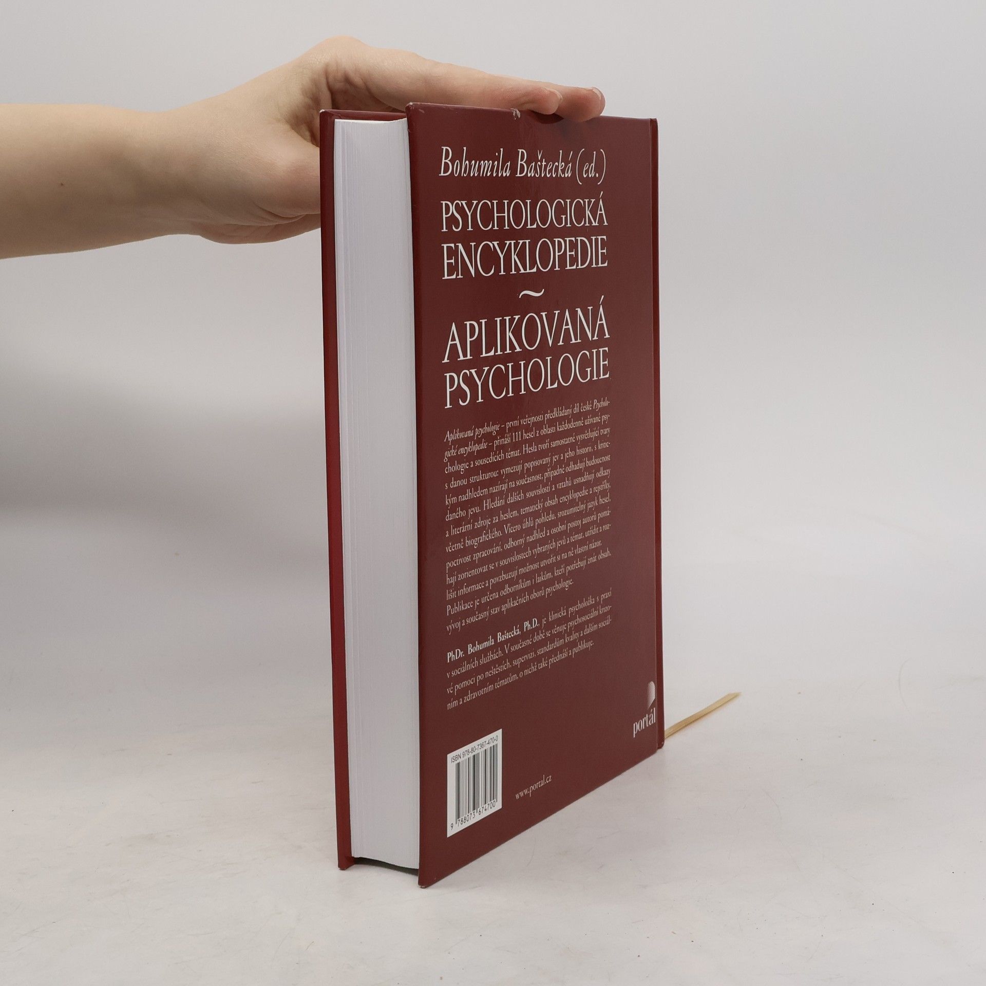 Publikace sestavená týmem našich předních odborníků představuje v ucelených statích současný stav bádání v oblasti aplikované psychologie a některých souvisejících disciplín. Obsah je strukturován do tematických bloků s jednotlivými hesly.Tato moderní encyklopedie by neměla chybět v knihovnách psychologů, psychiatrů, psychoterapeutů a dalších odborníků v pomáhajících profesích. Užitečným pomocníkem se může stát pro studenty psychologie a dalších humanitních oborů. PhDr. Bohumila Baštecká, Ph.D., je klinická psycholožka s praxí v sociálních službách. V současné době působí a vzdělává v oblasti psychosociální krizové pomoci po neštěstích, supervize, standardů kvality a dalších sociálních a zdravotních témat.