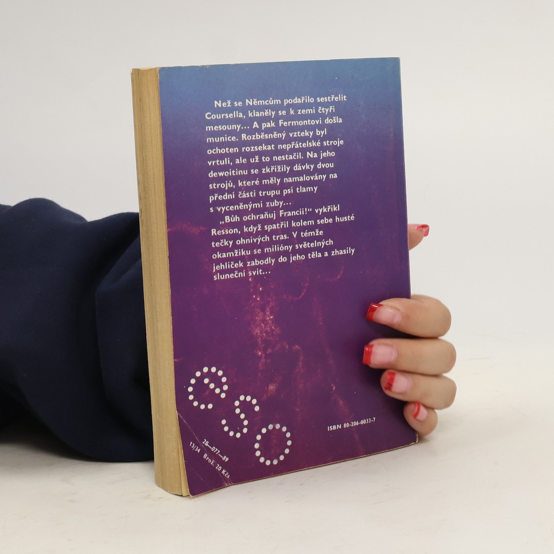 Než se Němcům podařilo sestřelit Coursella, klaněly se k zemi čtyři mesouny... A pak Fermontovi došla munice. Rozběsněný vzteky byl ochoten rozsekat nepřátelské stroje vrtulí, ale už to nestačil. Na jeho dewoitinu se zkřížily dávky dvou strojů, které měly namalovány na přední části trupu psí tlamy s vyceněnými zuby... "Bůh ochraňuj Francii!" vykřikl Resson, když spatřil kolem sebe husté tečky ohnivých tras. V témže okamžiku se milióny světelných jehliček zabodly do jeho těla a zhasily sluneční svit...