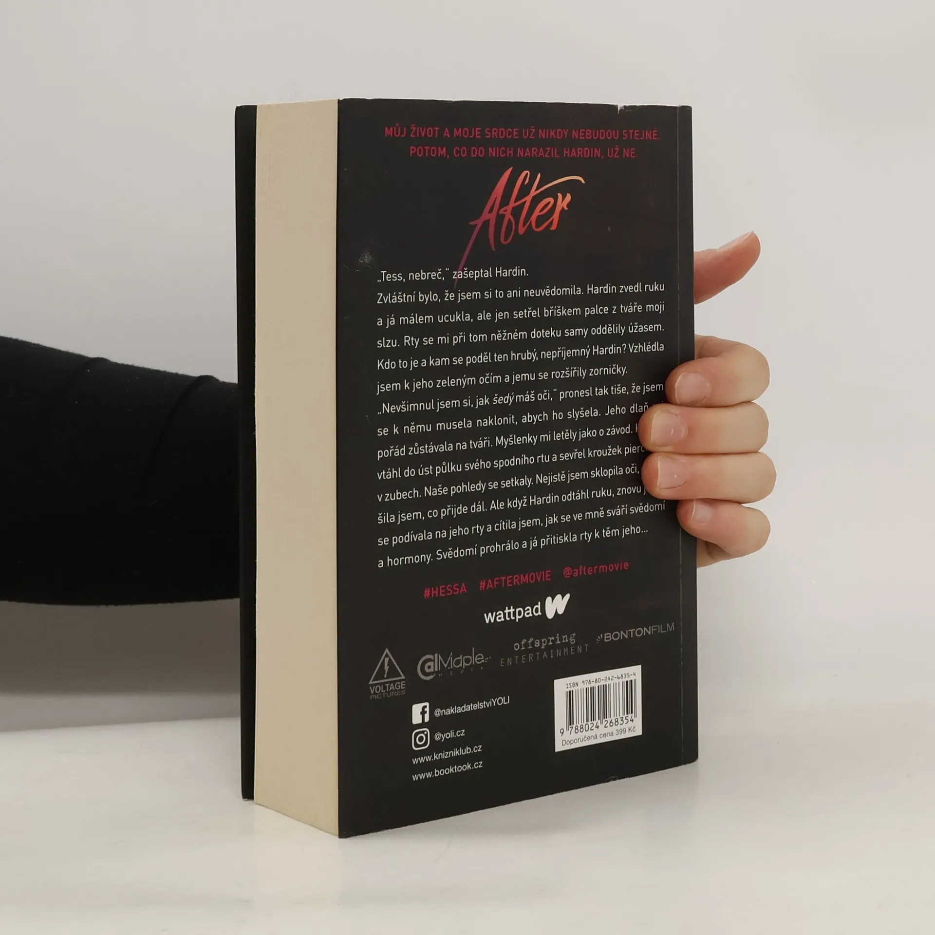 … můj život a moje srdce už nikdy nebudou stejné. Potom, co do nich narazil Hardin, už ne. Tessa má všechno – žije v láskyplném prostředí s chápající matkou a má kluka svých snů, laskavého, milého, kterého jí závidí všechny kamarádky. Lepšího už si ani nemohla přát. Tessin pohodový život ale v okamžiku změní jediné setkání. Hardin je pořádně drzý kluk, s nepřeslechnutelným, nafoukaným britským akcentem, sexy rozcuchem, tetováním a piercingem ve rtu. Tessa si nemůže pomoct – Hardin je zkrátka jiný než ostatní kluci, které poznala… A to po všech stránkách – dovede být i pěkně krutý. Neměla by ho spíš nenávidět? Neměla by jím Tessa pohrdat? Jak to, že se od něj nemůže odpoutat? Nedokáže to – i přes všechny jeho chyby a prohřešky. Intenzivní vášnivou blízkost střídají neustálá Hardinova zmizení a výbuchy vzteku. Může takhle vůbec vypadat láska? Tessa sama nevěří, že by takový vztah mohl fungovat. Ale… jde odolat jeho polibku? 3. vydání