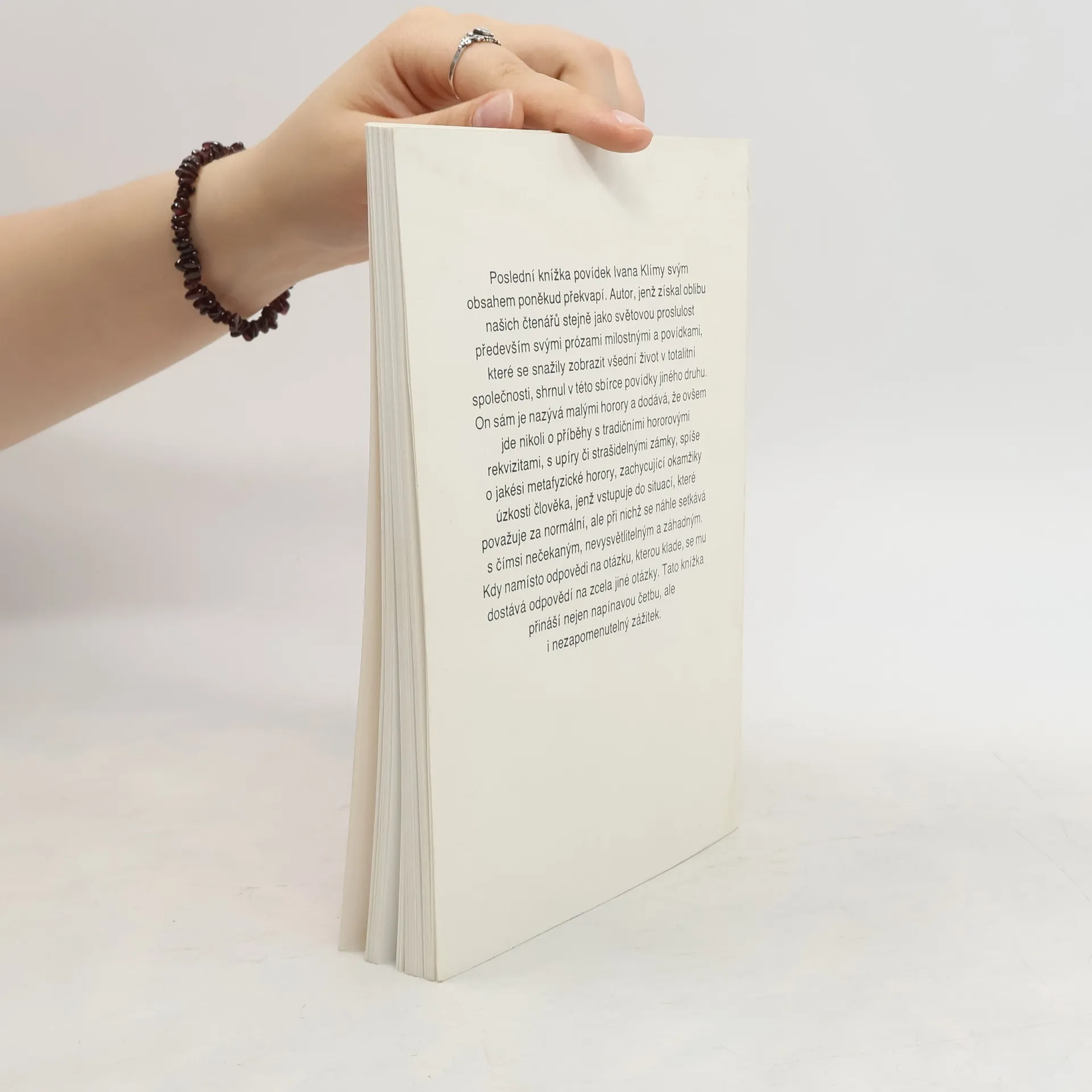 Tato knížka povídek Ivana Klímy svým obsahem poněkud překvapí. Autor, jenž získal oblibu především svými prózami milostnými a povídkami, které se snažily zobrazit všední život v totalitní společnosti, shrnul v této sbírce povídky jiného druhu. On sám je nazývá malými horory a dodává, že ovšem jde nikoli o příběhy s tradičními hororovými rekvizitami, s upíry či strašidelnými zámky, spíše o jakési metafyzické horory, zachycující okamžiky úzkosti člověka, jenž vstupuje do situací, které považuje za normální, ale při nichž se náhle setkává s čímsi nečekaným, nevysvětlitelným a záhadným. Kdy namísto odpovědi na otázku, kterou klade, se mu dostává odpovědí na zcela jiné otázky. Tato knížka přináší nejen napínavou četbu, ale i nezapomenutelný zážitek.... celý text