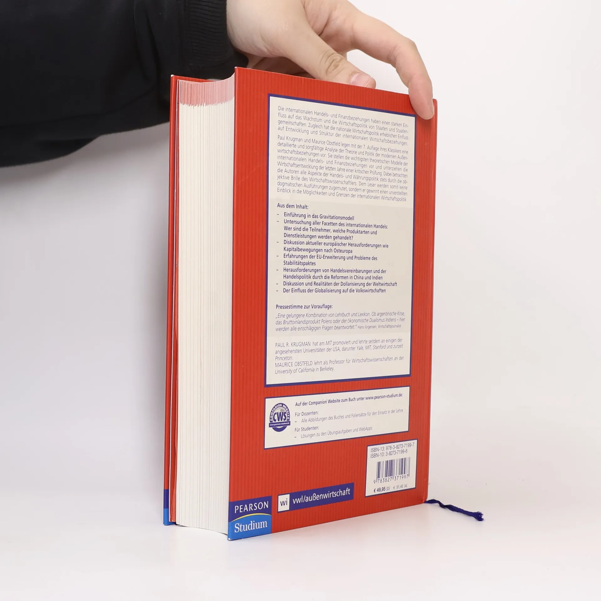 Zum Buch: Der internationale Handel ist eine wichtige Komponente der Wirtschaftspolitik für das Wachstum und die Entwicklung von Staaten. Krugman/Obstfeld legen mit dieser 7. Auflage ihres Klassikers eine detaillierte, stets akkurate und aktuelle Analyse der Grundlagen des modernen zwischenstaatlichen Handels vor. Die Autoren stellen die wichtigsten theoretischen Handelsmodelle vor und unterziehen die Wirtschaftsentwicklung der letzten Jahre einer kritischen Prüfung. Gleichzeitig zeigen die Autoren anhand von vielen internationalen Beispielen und Fallstudien die gelungene oder gescheiterte Umsetzung dieser Theorien auf und bewerten die makroökonomischen Auswirkungen solcher Modelle. Krugman/Obstfeld betrachten alle Aspekte der Handels- und Währungspolitik stets durch die objektive Brille des Wirtschaftswissenschaftlers und vermeiden dadurch, politische Stellung zu beziehen. Dem Leser werden somit keine dogmatischen Ausführungen zugemutet, sondern er gewinnt einen unverstellten Einblick in die Möglichkeiten und Grenzen der internationalen Wirtschaftspolitik.