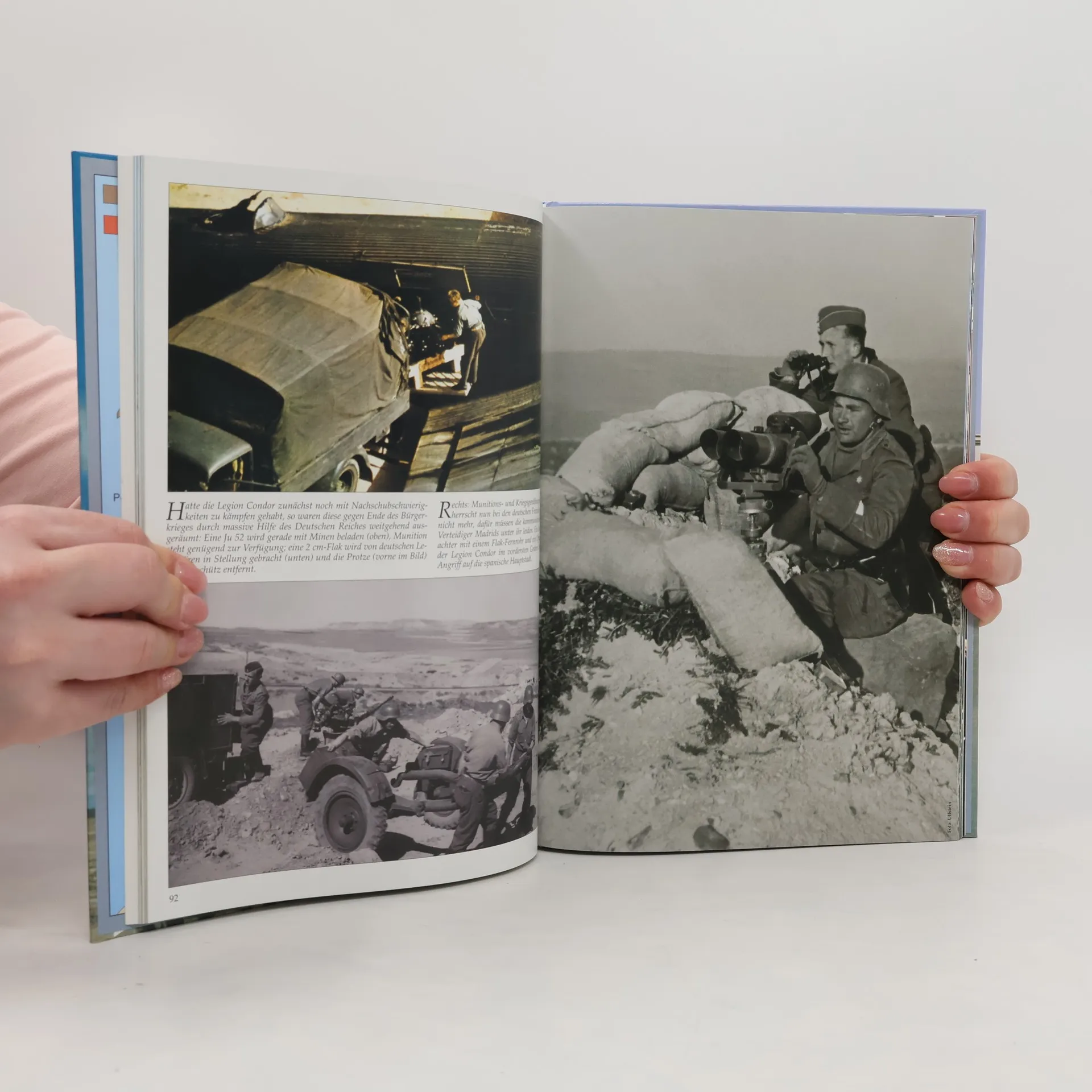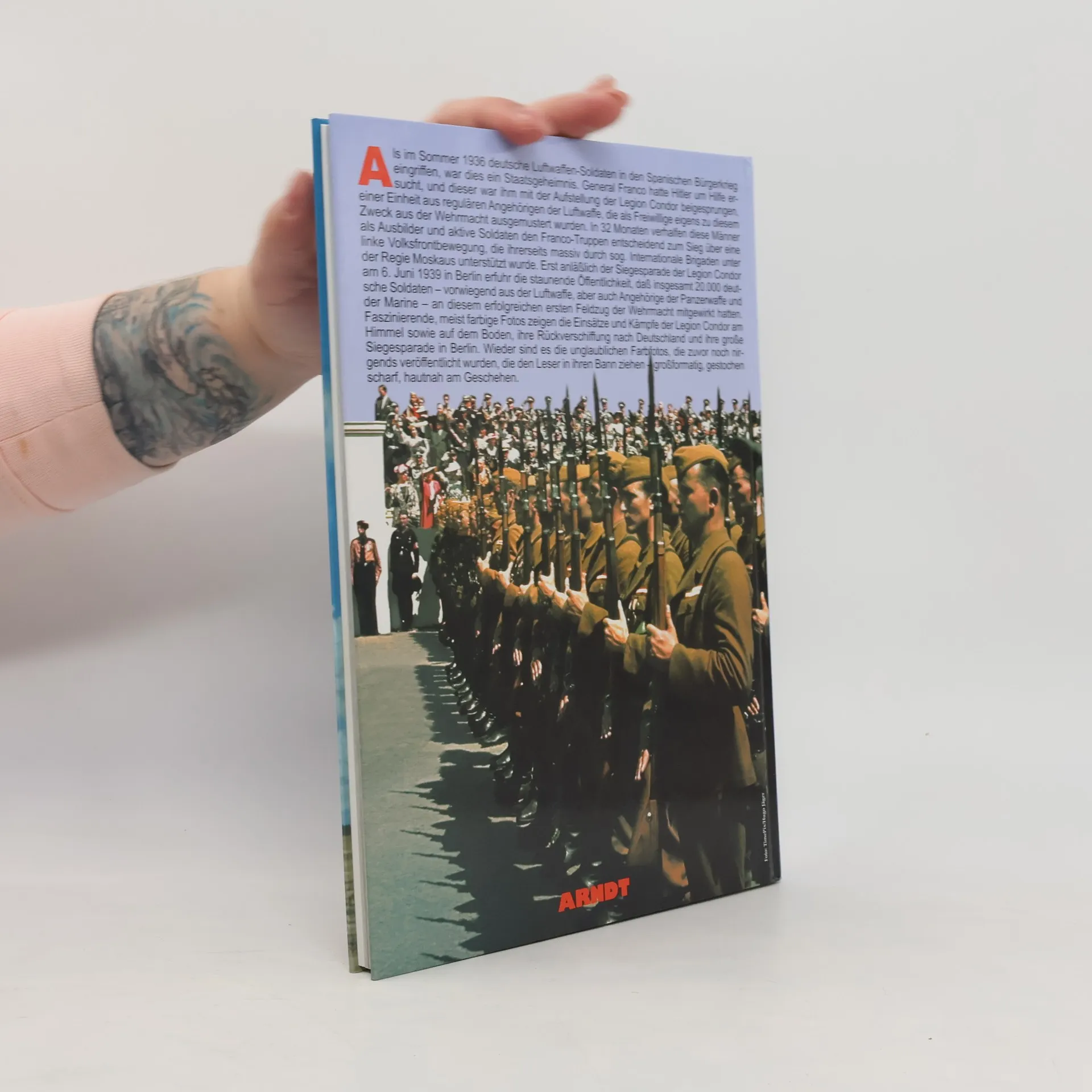Als im Sommer 1936 deutsche Luftwaffen-Soldaten in den Spanischen Bürgerkrieg eingriffen, war dies ein Staatsgeheimnis. General Franco hatte Hitler um Hilfe ersucht, und dieser war ihm mit der Aufstellung der Legion Condor beigesprungen, einer Einheit aus regulären Angehörigen der Luftwaffe, die als Freiwillige eigens zu diesem Zweck aus der Wehrmacht ausgemustert wurden. In 32 Monaten verhalfen diese Männer als Ausbilder und aktive Soldaten den Franco-Truppen entscheidend zum Sieg über eine linke Volksfrontbewegung, die ihrerseits massiv durch sogenannte Internationale Brigaden unter der Regie Moskaus unterstützt wurde. Erst anläßlich der Siegesparade der Legion Condor am 6. Juni 1939 in Berlin erfuhr die staunende Öffentlichkeit, daß insgesamt 18.000 deutsche Soldaten an diesem erfolgreichen ersten Feldzug der Wehrmacht mitgewirkt hatten. Faszinierende, meist farbige Fotos zeigen die Einsätze und Kämpfe der Legion Condor am Himmel sowie auf dem Boden, ihre Rückverschiffung nach Deutschland und ihre große Siegesparade in Berlin.