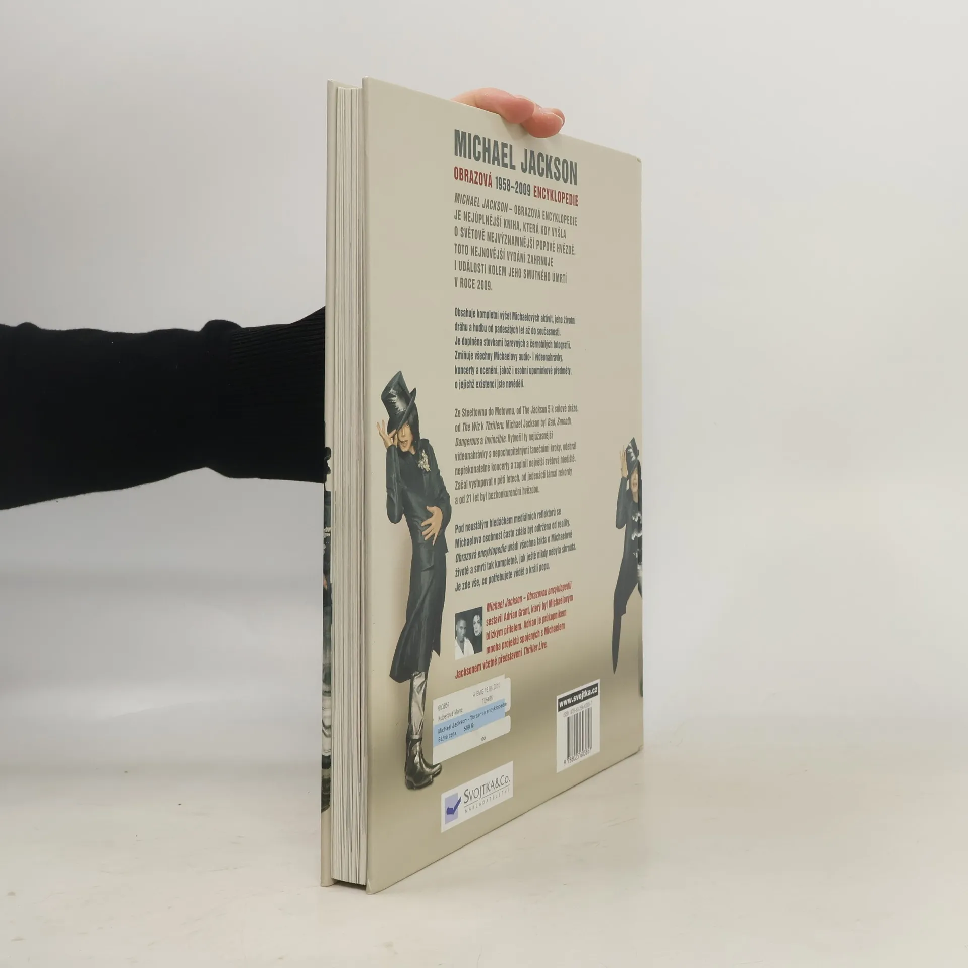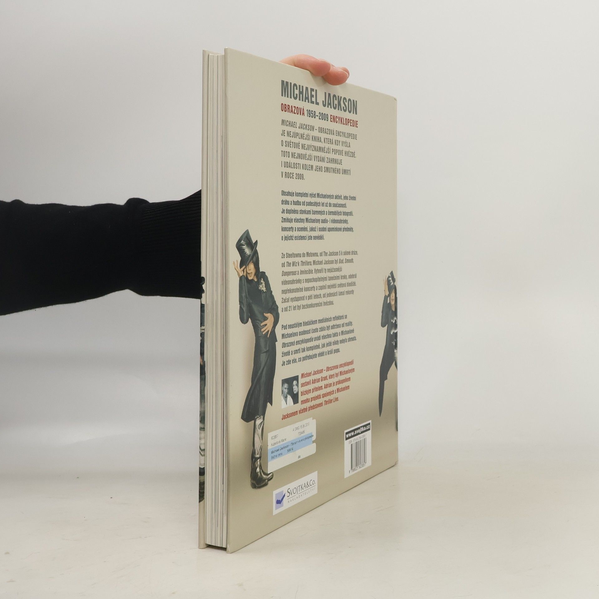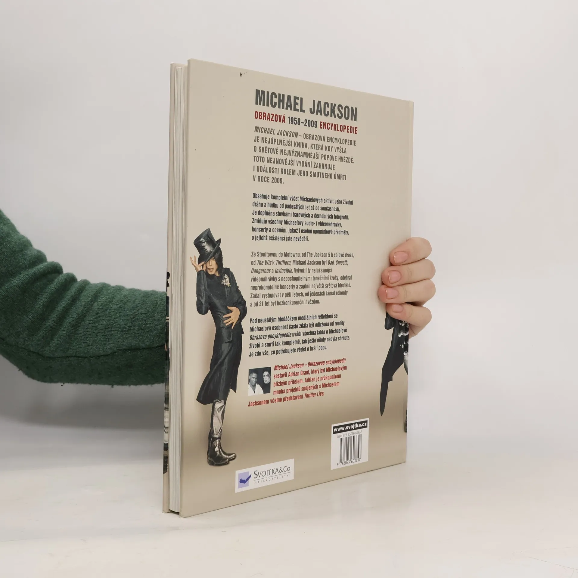 Kniha Michael Jackson – Obrazový dokument je nejúplnější knihou, která kdy o světově nejvýznamnější popové hvězdě vyšla. Byla připravována ještě za zpěvákova života a byla Michaelem Jacksonem autorizována. Později pak byla doplněna i o události kolem smutného úmrtí zpěváka v roce 2009. Najdete v ní kompletní výčet Michaelových aktivit, zmapování jeho životní dráhy a hudby od padesátých let až do současnosti. Je doplněna stovkami barevných a černobílých fotografií. Zahrnuje všechny jeho nahrávky, koncerty, videa a ceny, osobní pozoruhodnosti, o jejichž existenci jste nevěděli. Pod neustálým hledáčkem mediálních reflektorů se jeho osobnost často zdála být odtržena od reality – zde najdete všechna fakta o Michaelově životě a smrti jako v žádné knize předtím. Sestavil ji Adrian Grant, který byl jeho blízkým přítelem. Adrian je průkopníkem mnoha projektů spojených s M. Jacksonem včetně představení Thriller Live. Michael Jackson vytvořil ta nejúžasnější videa, předváděl jedinečné taneční kroky, odehrál nepřekonatelné koncerty a zaplnil největší světová hlediště. Začal vystupovat v pěti letech, od jedenácti lámal rekordy a od 21 let byl bezkonkurenční hvězdou. V této knize najdete zkrátka vše, co chcete o tomto králi popu vědět!
