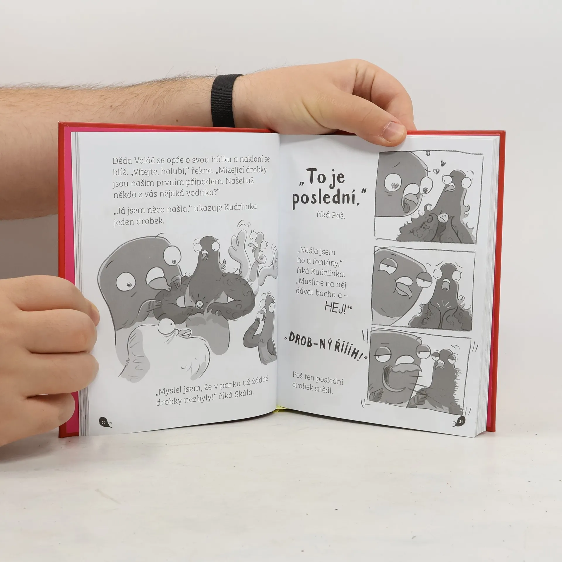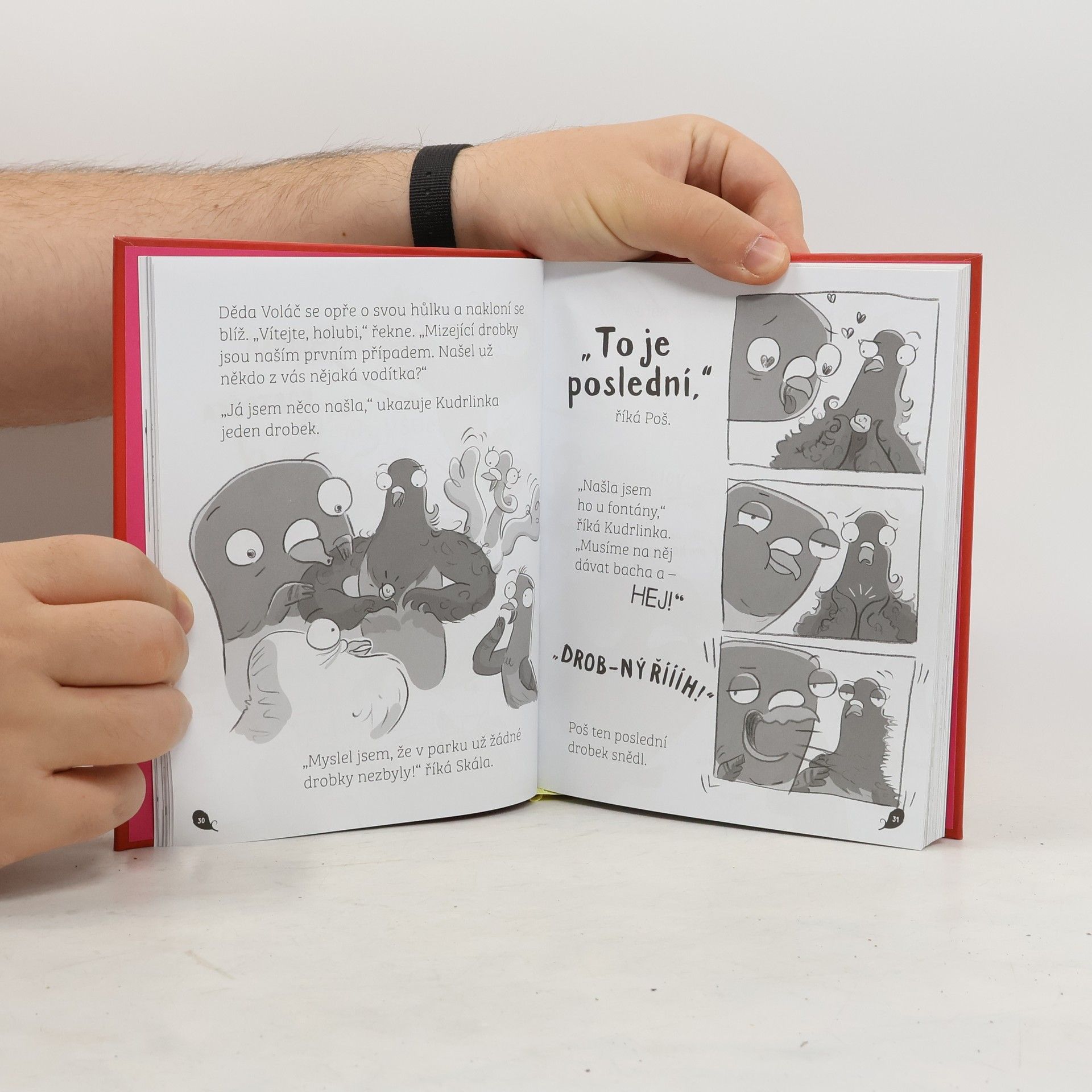 Už se vám doneslo, že vaše město střeží jednotka holubů, kteří pomocí svých holubích super schopností bojují se zločinem? Jednotku tvoří mistr převleků Skála, ohebná Kostrčka, silná Kudrlinka a přeborník v orientaci Poš, no a samozřejmě hlava jednotky - děda Voláč. V první ze série knih spolu s našimi hlavními hrdiny nahlédnete pod pokličku hned několika nezvyklým situacím, kdy z celého města zmizí všechny drobky, udeří tajemný lovec netopýrů a v neposlední řadě se pokusíte zneškodnit tikající bombu. Je víc než jasné, že společně s našimi holuby prožijete nejedno dobrodružství, vyřešíte hned několik záhad a dopadnete každého padoucha. Tato komiksová série knih o holubích dobrodružstvích je napsaná velmi mile a vtipně a spolu s použitými ilustracemi tvoří veselé i napínavé příběhy po všechny (zejména) malé čtenáře od šesti let.