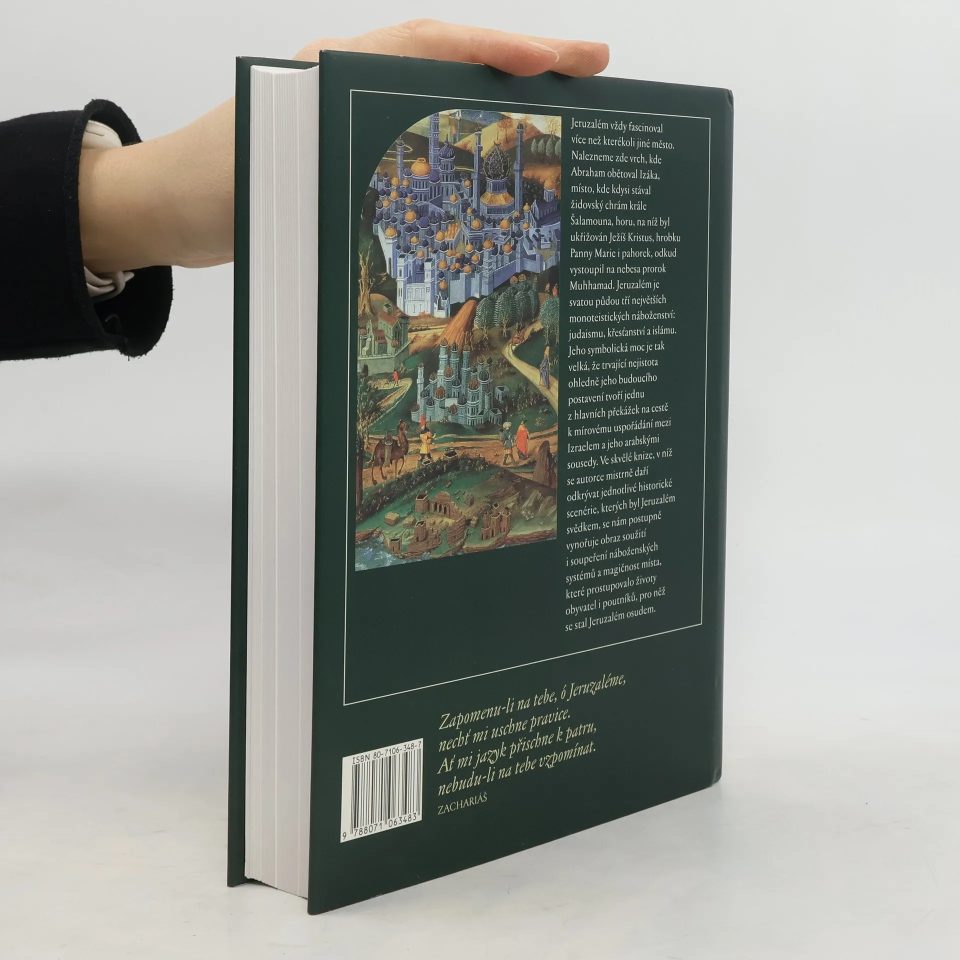 Dějiny posvátného města, které se stalo symbolem božství pro Židy, křesťany a muslimy. Dějiny města od biblických dob po neklidnou současnost, charakterizovanou židovsko-arabskými střety. Práce obsahuje nejenom historická fakta, ale je i jakýmsi hledáním duchovního rozměru hmotných dějin. Vytváří obraz města, které se stalo prostředkem identifikace víry.