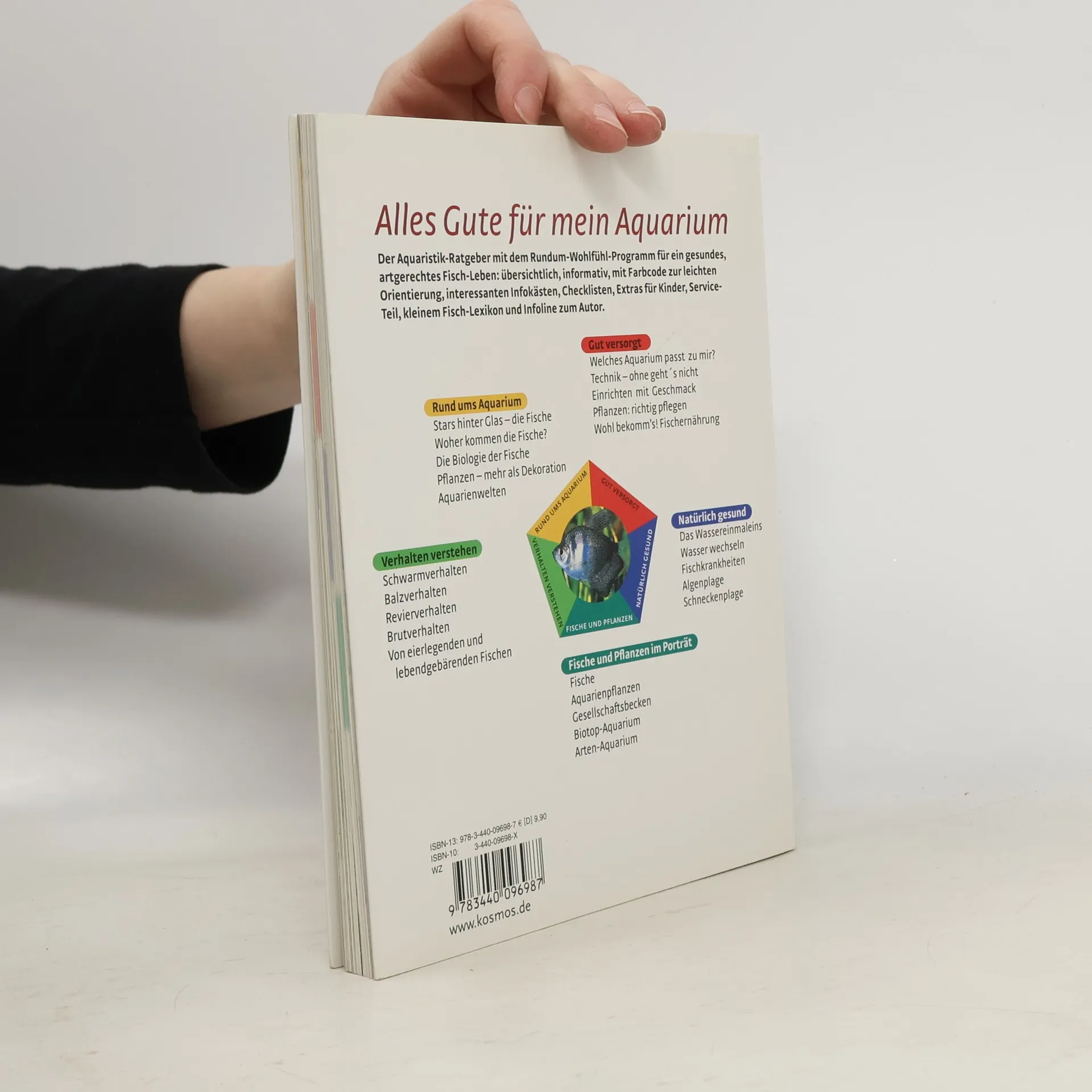 Anmutig schwimmende Fische in einer grünen Unterwasserlandschaft – Aquarien faszinieren und beruhigen zugleich. Aber wie gestaltet man sie und versorgt die Fische und Pflanzen richtig? Hier erfahren Sie, was Sie für Ihr Aquarium alles brauchen, wie Sie es einrichten und pflegen. -Acht praktische Info-Karten – mit nützlichen Informationen rund um Ihr Aquarium. Einfach heraustrennen, eintragen, mitnehmen, aufhängen, verschicken. Hier ist für jeden etwas dabei. -Der KOSMOS-Buchbegleiter – die schnelle Orientierungshilfe in der Umschlagklappe. Ausklappen und sofort wissen, was wo zu finden ist. -Im Porträt - die schönsten Aquarienfische und dekorative Aquarienpflanzen.