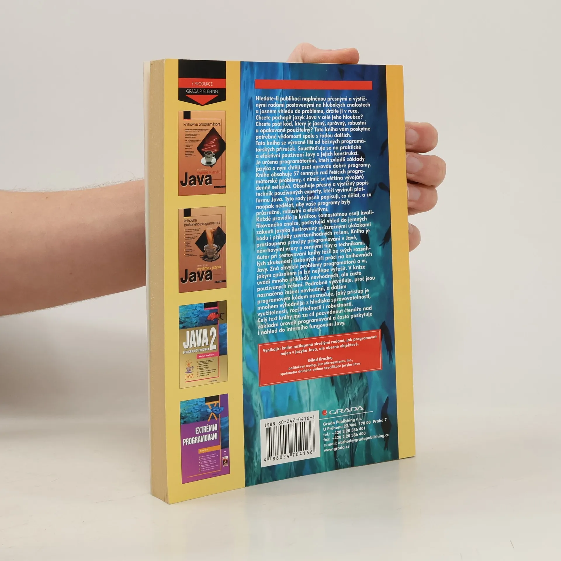Kniha se výrazně liší od běžných programátorských příruček, soustřeďuje se na praktické a efektivní používání Javy a jejích konstrukcí. Nabídne vám 57 cenných rad řešících programátorské problémy, s nimiž se většina vývojářů denně setkává. Obsahuje přesný a výstižný popis technik používaných experty, kteří vyvinuli platformu Java. Tyto rady jasně popisují, co dělat a co naopak nedělat, aby vaše programy byly průzračné, robustní a efektivní.
