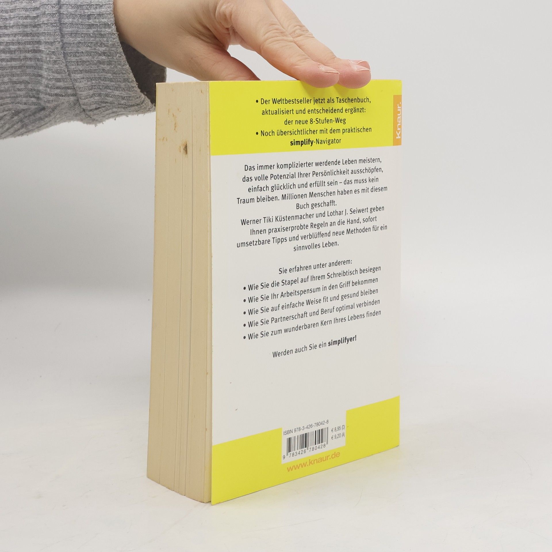 »Der Weltbestseller jetzt als Taschenbuch, aktualisiert und entscheidend ergänzt: der neue 8-Stufen-Weg« »Noch übersichtlicher mit dem praktischen simplify-Navigator« Das immer komplizierter werdende Leben meistern, das volle Potenzial Ihrer Persönlichkeit ausschöpfen, einfach glücklich und erfüllt sein – das muss kein Traum bleiben. Millionen Menschen haben es mit diesem Buch geschafft. Werner Tiki Küstenmacher und Lothar J. Seiwert geben Ihnen praxiserprobte Regeln an die Hand, sofort umsetzbare Tipps und verblüffend neue Methoden für ein sinnvolles Leben. Sie erfahren unter anderem: Wie Sie die Stapel auf Ihrem Schreibtisch besiegen Wie Sie Ihr Arbeitspensum in den Griff bekommen Wie Sie auf einfache Weise fit und gesund bleiben Wie Sie Partnerschaft und Beruf optimal verbinden Wie Sie zum wunderbaren Kern Ihres Lebens finden Werden auch Sie ein simplifyer!