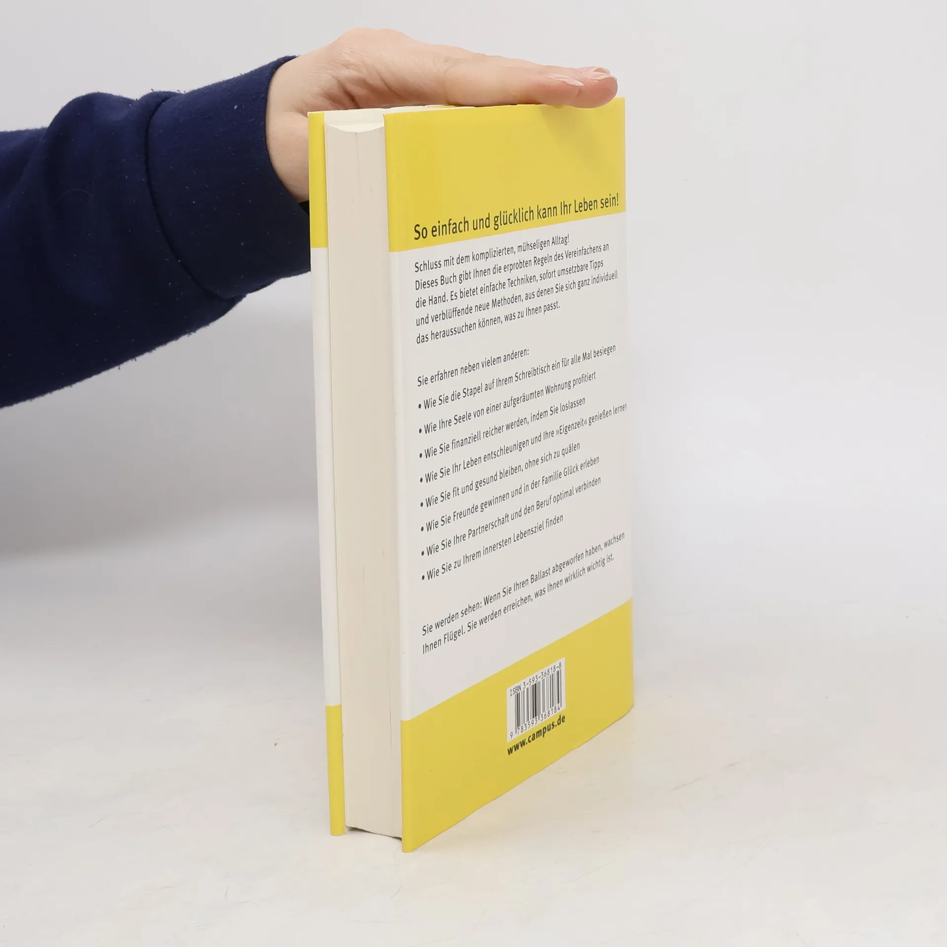 Die meisten Menschen leiden unter der Kompliziertheit des Lebens. simplify your life schafft Abhilfe, indem es jedem Leser die einfachen Regeln des Vereinfachens an die Hand gibt, mit denen er individuell und auf seine Bedürfnisse zugeschnitten sein Leben gestalten kann. Der simplify-Prozess ist ein spannender und einzigartiger Weg in sieben Etappen, an dessen Ende ein glückliches und zufriedenes Leben steht. Die Reise verläuft dabei vom Äußeren zum Inneren. Man beginnt mit dem Aufräumen und Vereinfachen des Schreibtischs, der Organisation der Zeit, gelangt zu den sozialen Beziehungen und Partnerschaften und bringt seine Geldangelegenheiten in Ordnung. Schließlich führt der simplify-Prozess weiter zum Körper und der Gesundheit und endet bei der zentralen Frage nach dem Selbst und dem Sinn des Lebens. Wie eine Raupe, die die Flügel des Schmetterlings als Anlage schon in sich trägt, wird der Leser den Weg zur Mitte - seinem Ich - und zum Wesentlichen finden. Am Ende, wenn er alle sieben Wege durchlaufen und sämtlichen Ballast abgeworfen hat, wachsen ihm Flügel und er kann endlich das erreichen, was ihm wirklich wichtig ist.