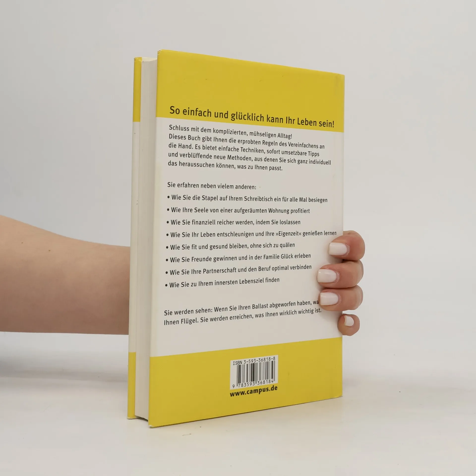 Die meisten Menschen leiden unter der Kompliziertheit des Lebens. simplify your life schafft Abhilfe, indem es jedem Leser die einfachen Regeln des Vereinfachens an die Hand gibt, mit denen er individuell und auf seine Bedürfnisse zugeschnitten sein Leben gestalten kann. Der simplify-Prozess ist ein spannender und einzigartiger Weg in sieben Etappen, an dessen Ende ein glückliches und zufriedenes Leben steht. Die Reise verläuft dabei vom Äußeren zum Inneren. Man beginnt mit dem Aufräumen und Vereinfachen des Schreibtischs, der Organisation der Zeit, gelangt zu den sozialen Beziehungen und Partnerschaften und bringt seine Geldangelegenheiten in Ordnung. Schließlich führt der simplify-Prozess weiter zum Körper und der Gesundheit und endet bei der zentralen Frage nach dem Selbst und dem Sinn des Lebens. Wie eine Raupe, die die Flügel des Schmetterlings als Anlage schon in sich trägt, wird der Leser den Weg zur Mitte - seinem Ich - und zum Wesentlichen finden. Am Ende, wenn er alle sieben Wege durchlaufen und sämtlichen Ballast abgeworfen hat, wachsen ihm Flügel und er kann endlich das erreichen, was ihm wirklich wichtig ist.