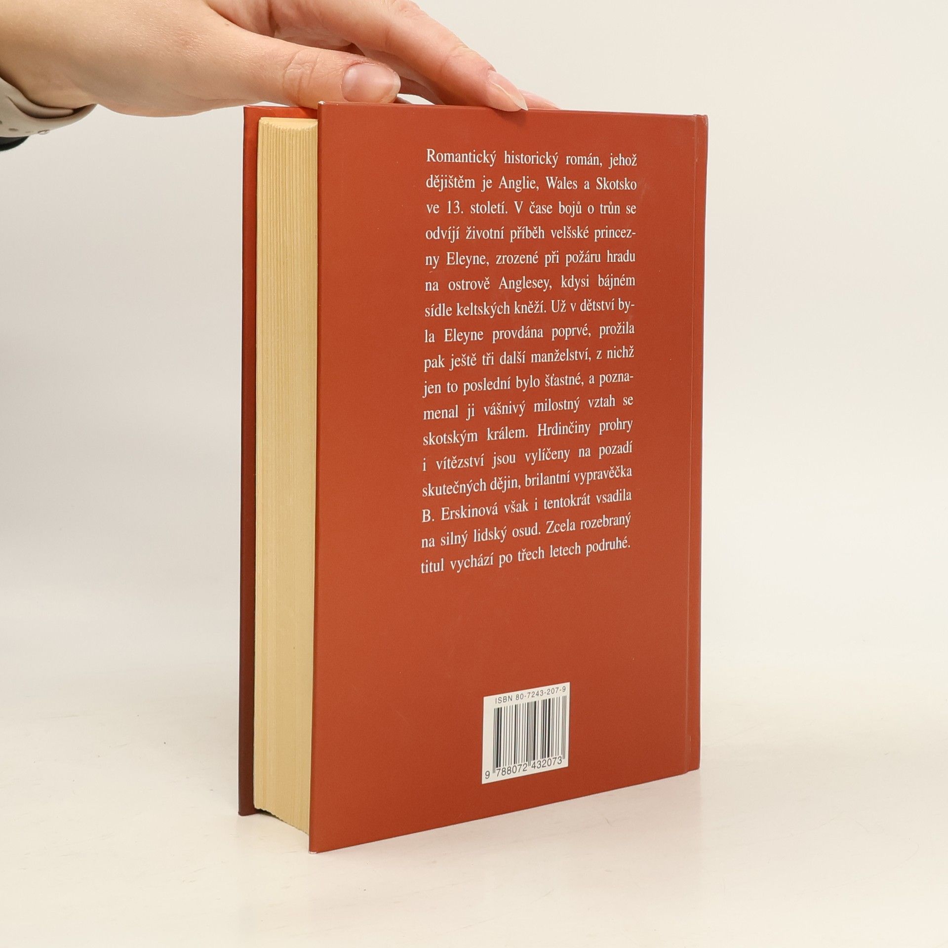 Romantický historický román, jehož dějištěm je Anglie, Wales a Skotsko ve 13. století. V dramatickém čase bojů o trůn se odvíjí dlouhý a pohnutý životní příběh velšské princezny Eleyne, zrozené za požáru hradu na ostrově Anglesey, kdysi bájném sídle druidů. Už v dětství byla Eleyne provdána poprve, prožila pak ještě tři další manželství, z nichž jen to poslední bylo šťastné, poznamenal ji osudový milostný vztah se skotským králem. Hrdinčiny prohry a vítězství, vášnivé lásky, mateřské radosti a trápení i její tajuplné schůzky s duchem královského milence jsou vylíčeny na pozadí skutečných dějinných událostí. Brilantní vypravěčka B. Erskinová však i tentokrát vsadila hlavně na silný lidský příběh.