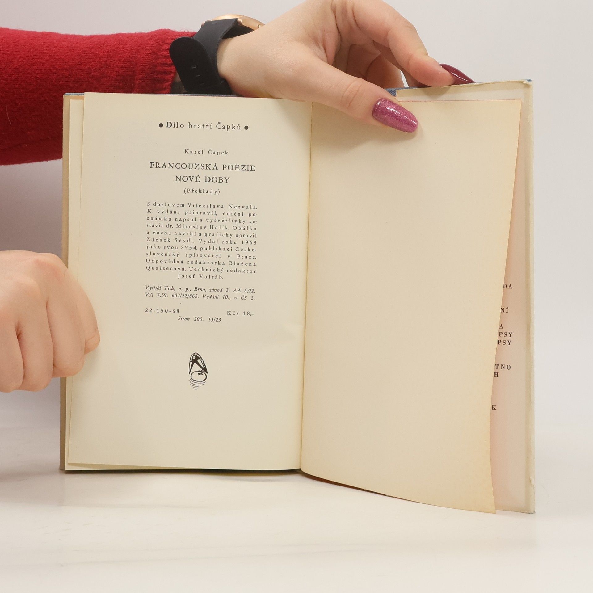 Výběr z překladů francouzské poezie oprostil autor ode všech zastaralých a násilných obratů. Doslov napsal Vítězslav Nezval, k vydání připravil dr. Miroslav Halík. Desáté vydání, v Československém spisovateli první.