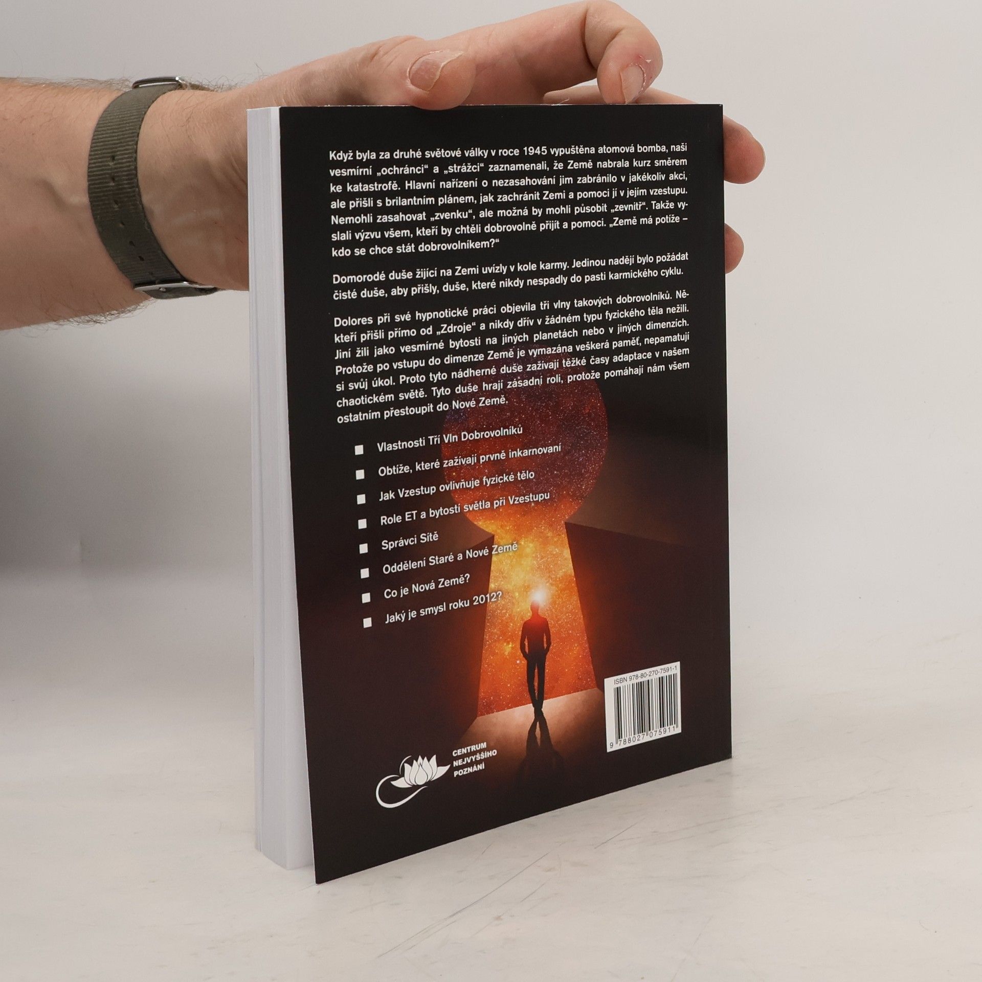 V roce 1945, když byla za druhé světové války vypuštěna atomová bomba, naši „ochránci“ a „strážci“ ve vesmíru zjistili, že Země nabrala kurz směrem ke katastrofě. Hlavní nařízení o nezasahování jim zabránilo v jakékoliv akci, ale přišli s brilantním plánem, jak zachránit Zemi a pomoci jí v jejím vzestupu. Nemohli zasahovat „zvenku“, ale možná by mohli působit „zevnitř“. Takže vyslali výzvu všem, kteří by chtěli dobrovolně přijít na pomoc. „Země má potíže – kdo se chce stát dobrovolníkem?“ Domorodé duše žijící na Zemi uvízly v kole karmy. Jedinou nadějí bylo požádat čisté duše, aby přišly, duše, které nikdy nespadly do pasti karmického cyklu. Dolores při její hypnotické práci objevila tři vlny takových dobrovolníků. Někteří přišli přímo od „Zdroje“ a nikdy dřív v žádném typu fyzického těla nežili. Jiní žili jako vesmírné bytosti na jiných planetách nebo v jiných dimenzích. Protože po vstupu do dimenze Země je vymazána veškerá paměť, nepamatují si svůj úkol. Proto tyto nádherné duše zažívají těžké časy adaptace v našem chaotickém světě. Tyto duše hrají zásadní roli, protože pomáhají nám všem ostatním přestoupit do Nové Země. Vlastnosti Tří Vln Dobrovolníků Obtíže, které zažívají prvně-inkarnovaní Jak Vzestup ovlivňuje fyzické tělo Role ET a bytostí světla při Vzestupu Správci Sítě Co je Nová Země? Jaký je smysl roku 2012?