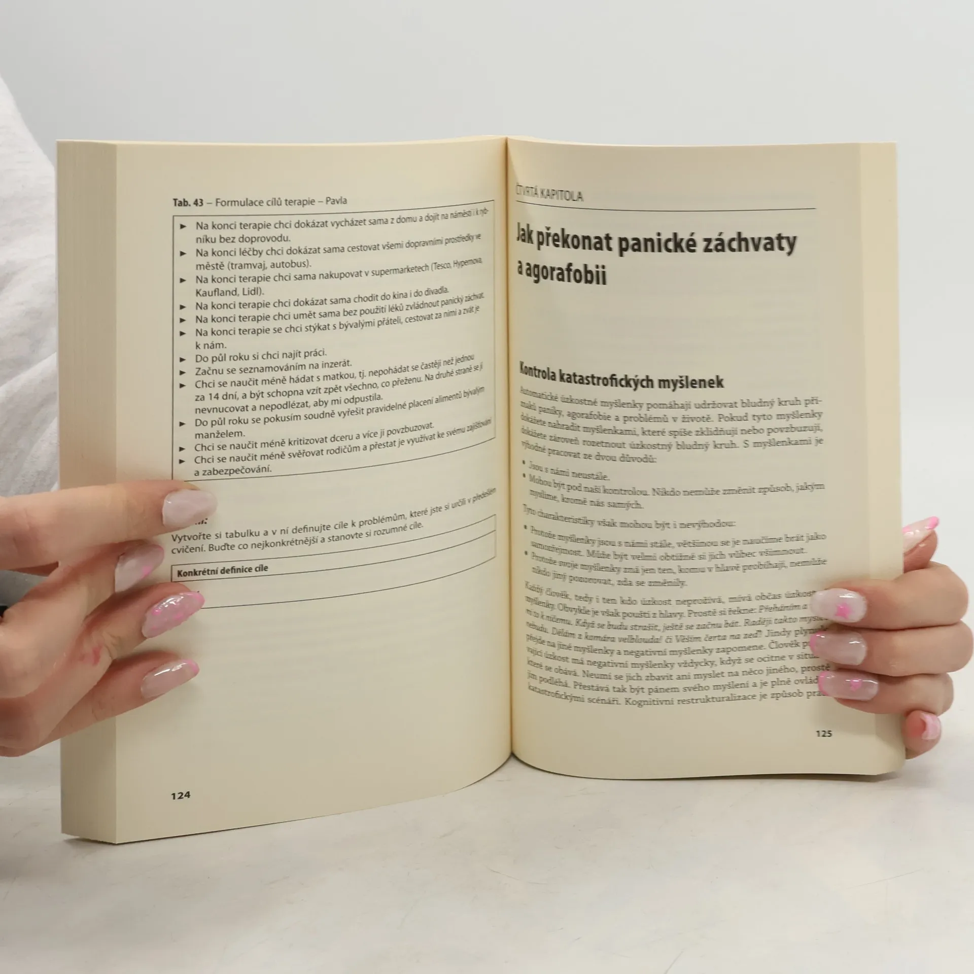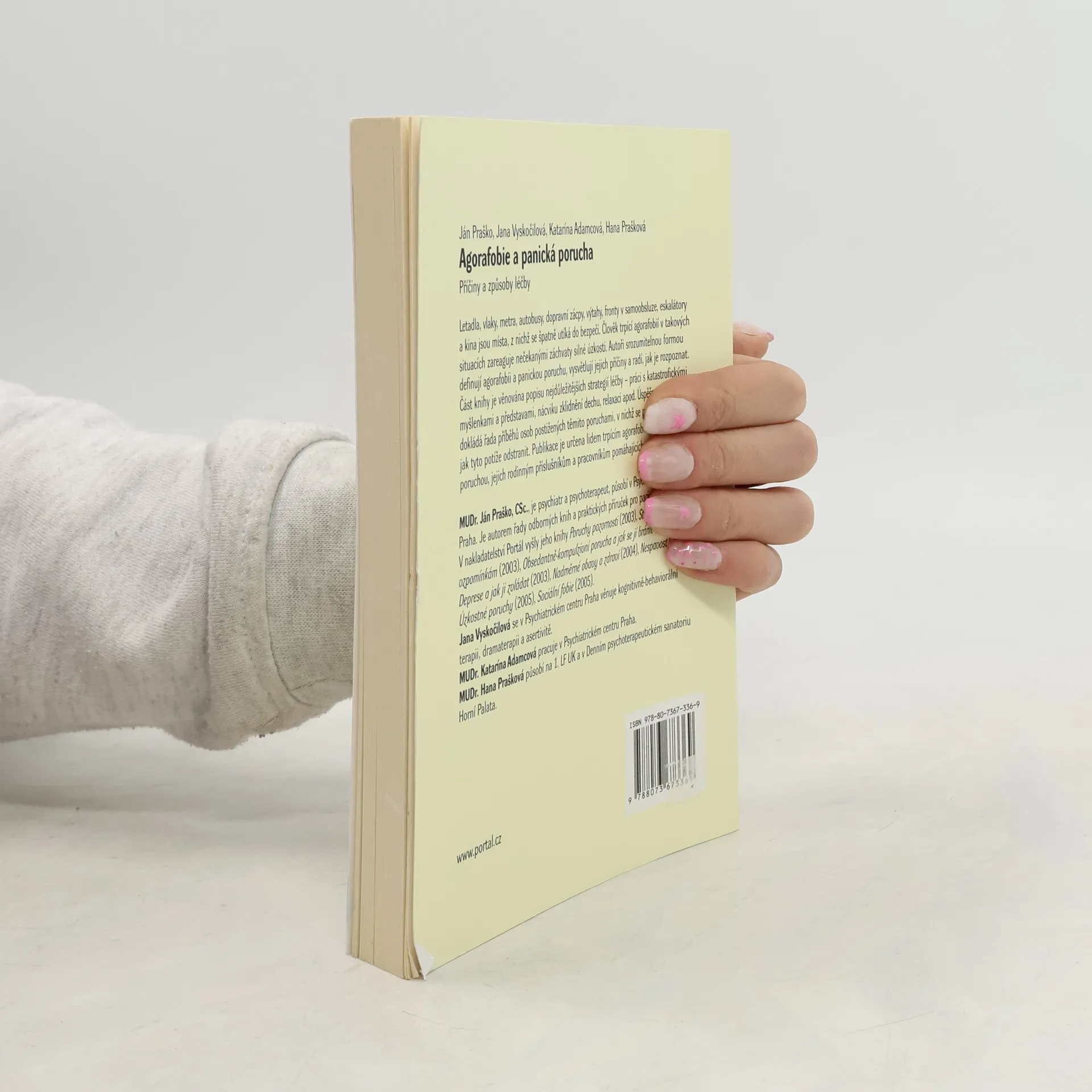 Příčiny a způsoby léčby. Letadla, vlaky, metra, autobusy, dopravní zácpy, výtahy, fronty v samoobsluze, eskalátory a kina jsou místa, z nichž se špatně utíká do bezpečí. Podobně, bez možnosti dovolat se pomoci, se člověk cítí, když je doma sám, nebo když je na nějakém osamělém místě (například v lese). Ve srozumitelně psané příručce se čtenáři dozvědí, jak mohou rozpoznat, zda oni sami nebo jejich příbuzní trpí agorafobií či panickou poruchou a co je jejich příčinou. Část knihy je věnována popisu nejdůležitějších strategií léčby – práci s katastrofickými myšlenkami a představami, nácviku zklidnění dechu, relaxaci apod. Úspěšnost terapie dokládá řada příběhů osob postižených těmito poruchami, v nichž popisují způsoby, jak se jim tyto potíže podařilo odstranit. Publikace je určena lidem trpícím agorafobií či panickou poruchou, jejich rodinným příslušníkům a pracovníkům pomáhajících profesí.