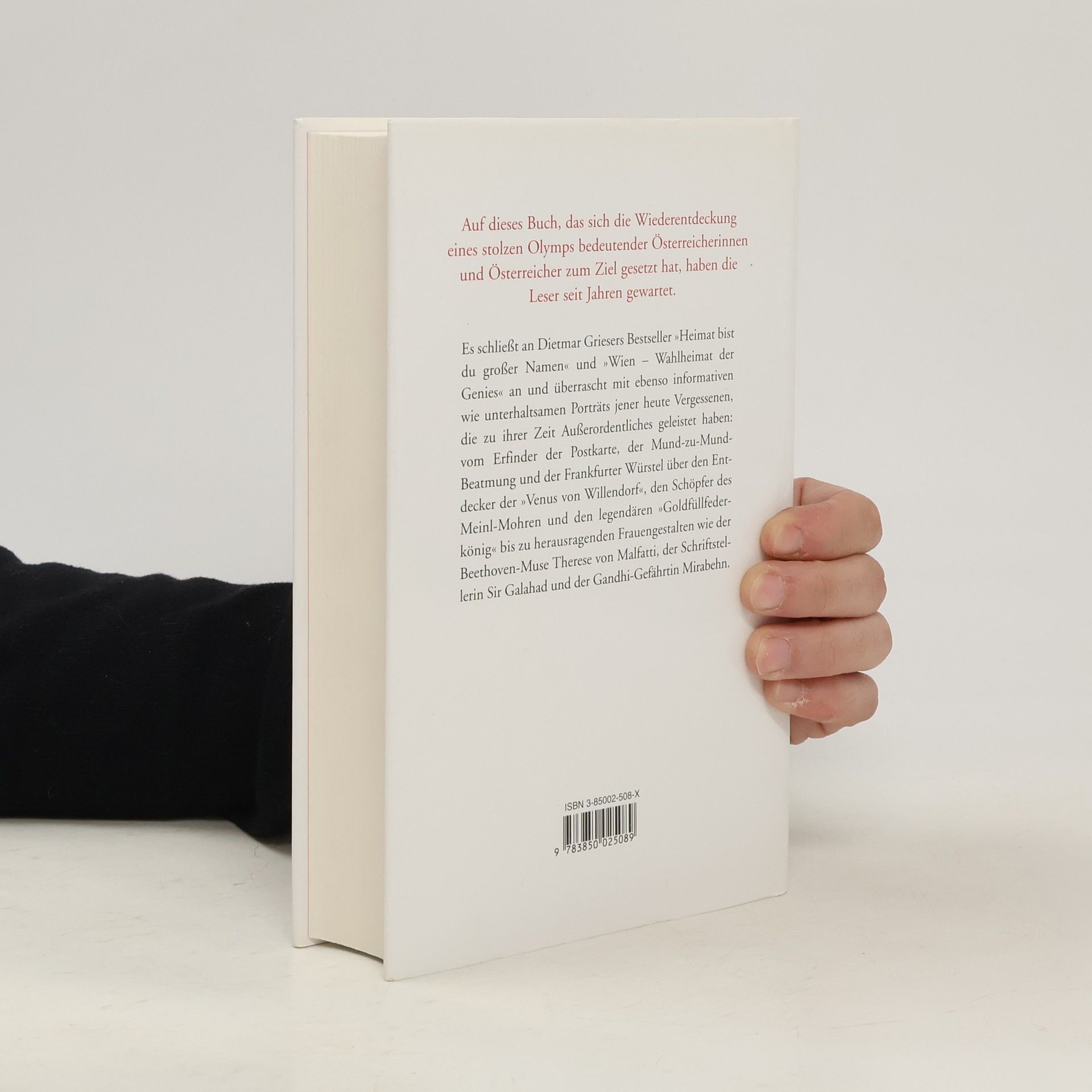 Auf dieses Buch, das sich die Wiederentdeckung eines stolzen Olymps bedeutender Österreicherinnen und Österreicher zum Ziel gesetzt hat, haben die Leser seit Jahren gewartet. Es schließt an Dietmar Griesers Bestseller „Heimat bist du großer Namen“ und „Wien - Wahlheimat der Genies“ an und überrascht mit ebenso informativen wie unterhaltsamen Porträts jener heute Vergessenen, die zu ihrer Zeit Außerordentliches geleistet haben: vom Erfinder der Postkarte, der Mund-zu-Mund-Beatmung und der Frankfurter Würstel über den Entdecker der „Venus von Willendorf“, den Schöpfer des Meinl-Mohren und den legendären „Goldfüllfederkönig“ bis zu herausragenden Frauengestalten wie der Beethoven-Muse Therese von Malfatti, der Schriftstellerin Sir Galahad und der Gandhi-Gefährtin Mirabehn.