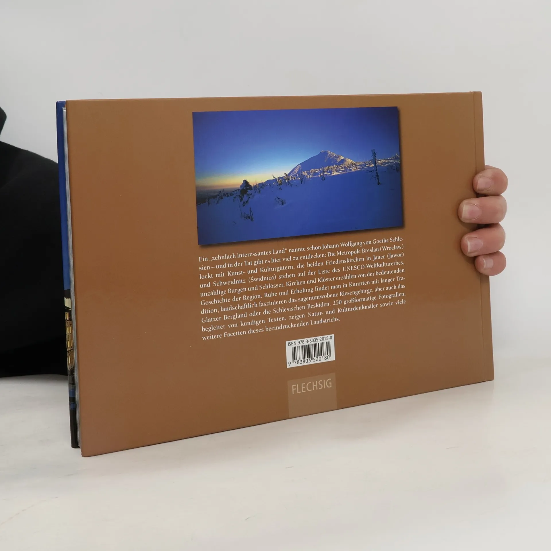 Schlesien, das „zehnfach interessante Land“, wie schon Goethe erkannte, verzaubert durch seine reichen Kunst- und Kulturdenkmäler in einer romantischen Landschaft, die schon Joseph von Eichendorff besang und die durch die Sagenfigur des Rübezahl berühmt geworden ist. Zahlreiche großformatige Fotografien zeigen die Friedenskirchen in Schweidnitz und Jauer, das sagenumwobene Riesengebirge, Breslau, das Vorgebirge der Karpaten und vieles mehr.