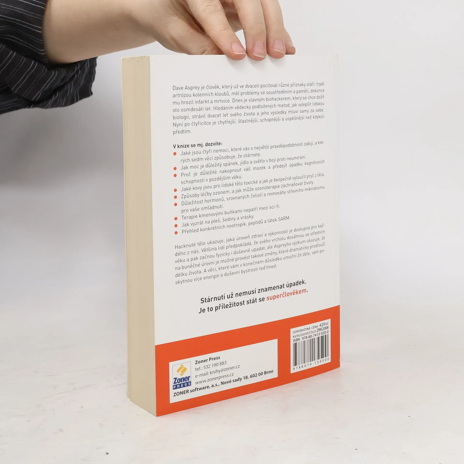 Dave Asprey, biohacker a zakladatel hnutí za zdravější životní styl, se ve svých dvaceti letech potýkal s vážnými zdravotními problémy, které mu hrozily infarktem a mrtvicí. Po dvaceti letech výzkumu se transformoval na úspěšného muže, který usiluje o dožití se sto osmdesáti let. V knize se dozvíte o čtyřech nejčastějších příčinách úmrtí a sedmi faktorech urychlujících stárnutí. Důraz je kladen na význam spánku, stravy a světla v prevenci stárnutí, stejně jako na stimulaci mozku pro udržení kognitivních schopností. Autor také zmiňuje toxické kovy a metody jejich bezpečného odstranění z těla, léčbu ozonem a důležitost hormonů, čelistní rovnováhy a zdravého mikrobiomu pro omlazení. Terapie kmenovými buňkami jsou představeny jako realistická možnost, zatímco se nabízí řešení pro plešatost, šediny a vrásky. Obsahuje také přehled nootropik a peptidů. Aspreyho přístup ukazuje, že stárnutí nemusí znamenat úpadek, ale může být příležitostí k dosažení vyšší úrovně zdraví a výkonnosti, což přináší více energie a duševní bystrosti.