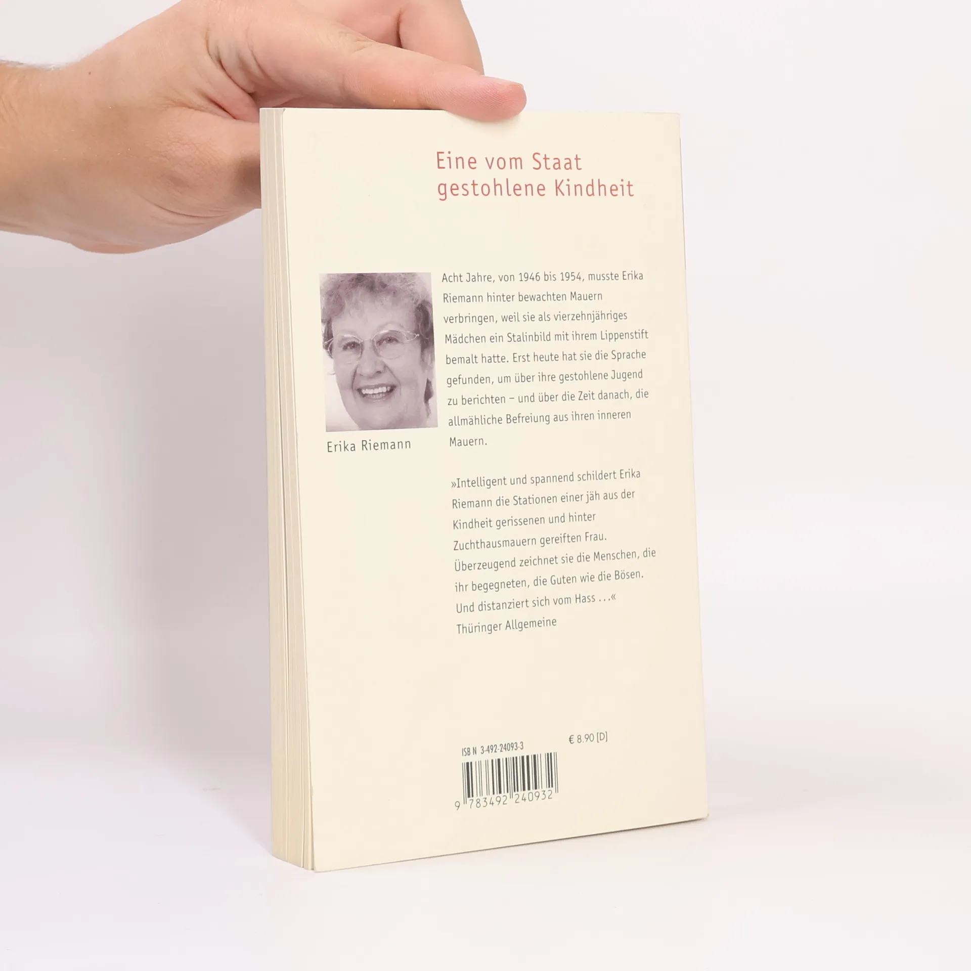 "Acht Jahre, von 1946 bis 1954, musste Erika Riemann hinter bewachten Mauern verbringen, weil sie als vierzehnjähriges Mädchen ein Stalin-Bild mit ihrem Lippenstift bemalt hatte. Erst heute hat sie die Sprache gefunden, um über ihre gestohlene Jugend zu berichten - und über die Zeit danach, die allmähliche Befreiung aus ihren inneren Mauern. "