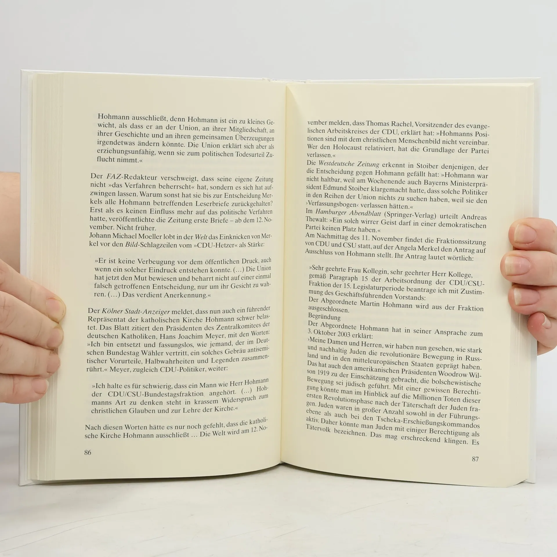 Der „Fall Hohmann“ - Ein einmaliger Vorgang in der deutschen Parteiengeschichte. Parteibasis gegen Entscheidung der Parteiführung Aus dem Sondervotum des Bundesparteigerichts der CDU am 6. November 2004, von Friedrich-Wilhelm Siebeke, stellv. Vorsitzender: „In welch großem Umfang CDU-Mitglieder sich gegen den Parteiausschuss Hohmann wenden, wird weiter belegt durch den großen Anteil von Zuschriften an den Initiator der Aktion “Kritische Solidarität mit Hohmann„, Fritz Schenk. In diesen Zuschriften wird häufig unter Hinweis auf die eigene CDU-Mitgliedschaft gegen den Parteiausschluss protestiert. Bei der Prüfung der Frage, ob der Antragsgegner der CDU einen schweren Schaden zugefügt habe, hätten weiterhin die Tausende von Anrufen und Zuschriften an die Parteiführung von der Entscheidungsmehrheit bei der Prüfung des Ausschlusstatbestandes nicht übergangen werden dürfen. Stellen doch diese Anrufe und Zuschriften ein Aufbegehren eines nicht unbeachtlichen Teils der Parteibasis gegen eine Entscheidung der Parteiführung dar, ein Ereignis, das in diesem Umfang in der bisherigen Parteigeschichte noch nicht zu verzeichnen war.“