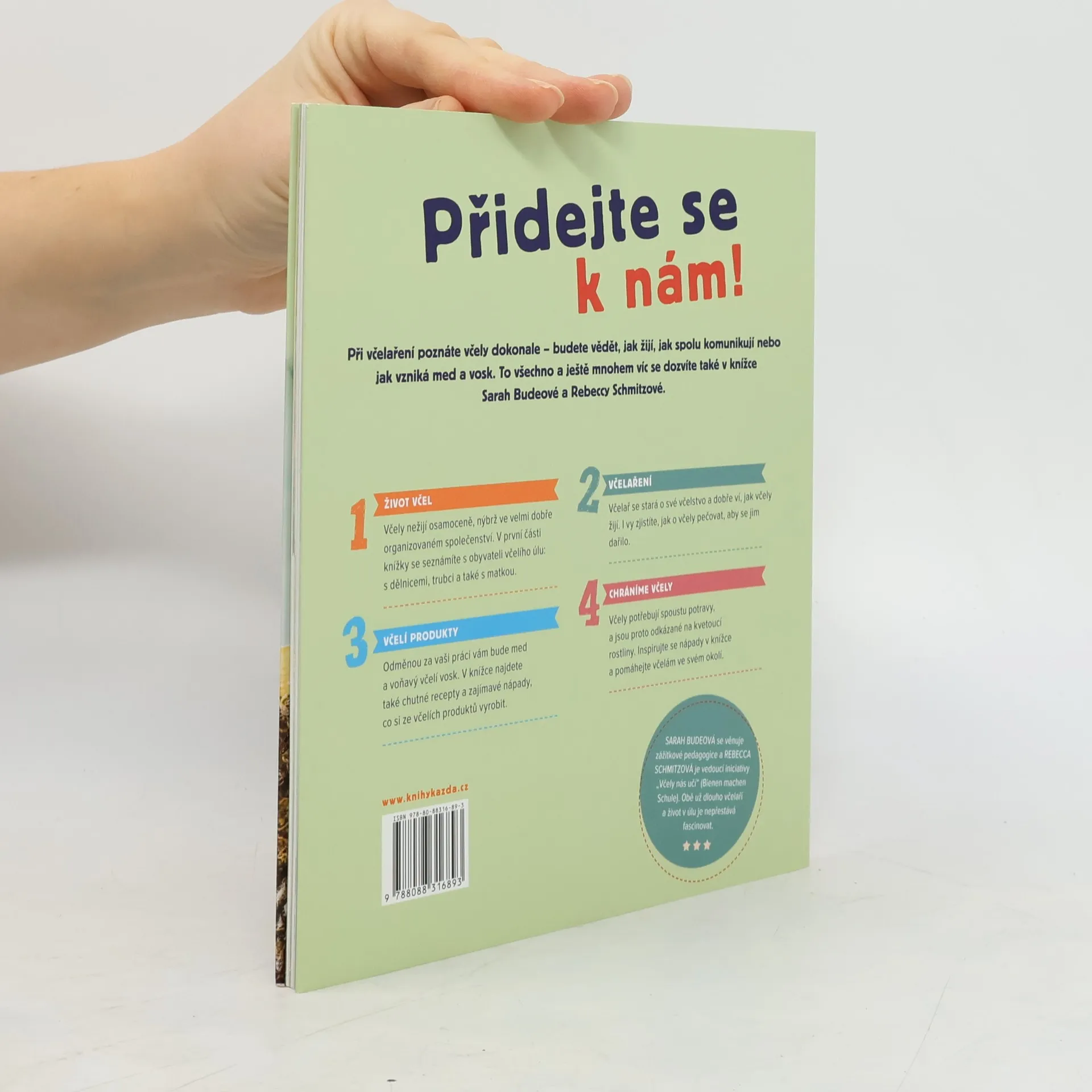 Při včelaření poznáte včely dokonale - budete vědět, jak žijí, jak spolu komunikují nebo jak vzniká med a vosk. To všechno a ještě mnohem víc se dozvíte také v knížce Sarah Budeové a Rebeccy Schmitzové. 1. Život včel Včely nežijí osamoceně, nýbrž ve velmi dobře organizovaném společenství. V první části knížky se seznámíte s obyvateli včelího úlu: s dělnicemi, trubci a také s matkou. 2. Včelaření Včelař se stará o své včelstvo a dobře ví, jak včely žijí. I vy zjistíte, jak o včely pečovat, aby se jim dařilo. 3. Včelí produkty Odměnou za vaši práci vám bude med a voňavý včelí vosk. V knížce najdete také chutné recepty a zajímavé nápady, co si ze včelích produktů vyrobit. 4. Chráníme včely Včely potřebují spoustu potravy, a jsou proto odkázané na kvetoucí rostliny. Inspirujte se nápady v knížce a pomáhejte včelám ve svém okolí.