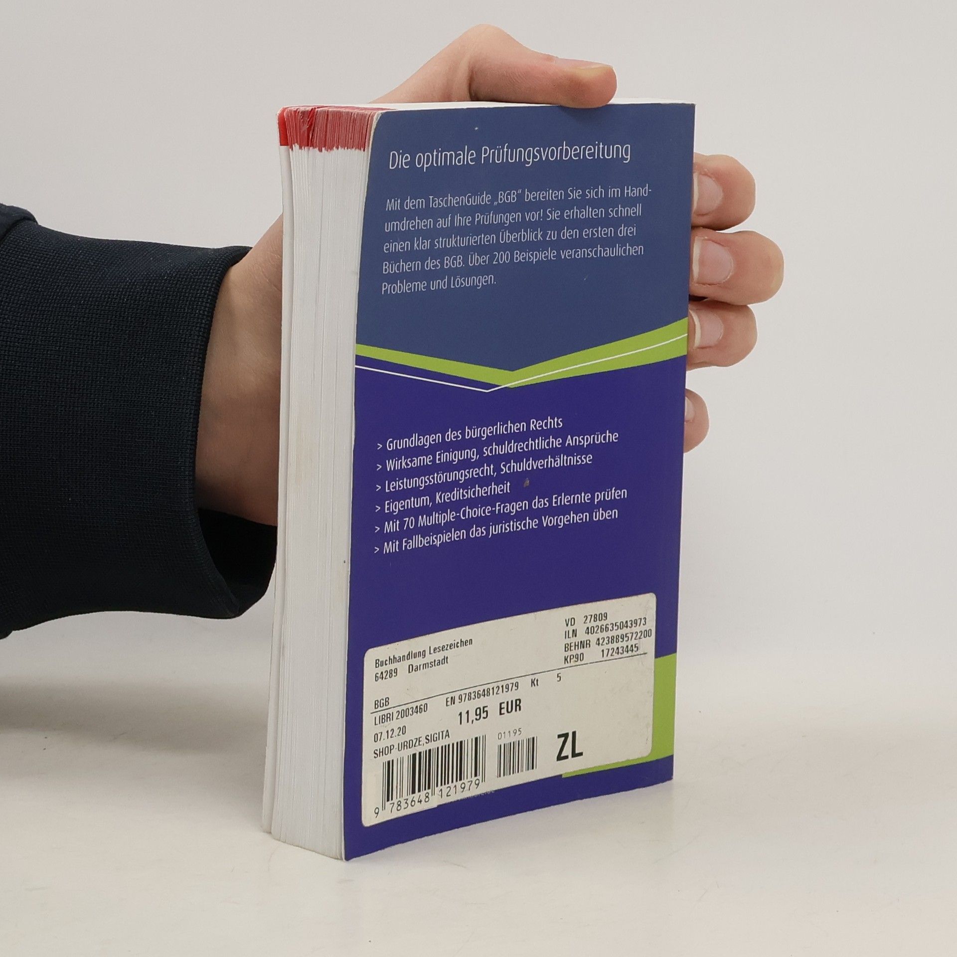 Mit dem TaschenGuide „BGB" bereiten Sie sich im Handumdrehen auf Ihre Prüfungen vor! Sie erhalten schnell einen klar strukturierten Überblick zu den ersten drei Büchern des BGB. Über 200 Beispiele veranschaulichen Probleme und Lösungen. Inhalte: Grundlagen des bürgerlichen Rechts Wirksame Einigung, schuldrechtliche Ansprüche Leistungsstörungsrecht, Schuldverhältnisse Eigentum, Kreditsicherheit Mit 70 Multiple-Choice-Fragen das Erlernte prüfen Mit Fallbeispielen das juristische Vorgehen üben