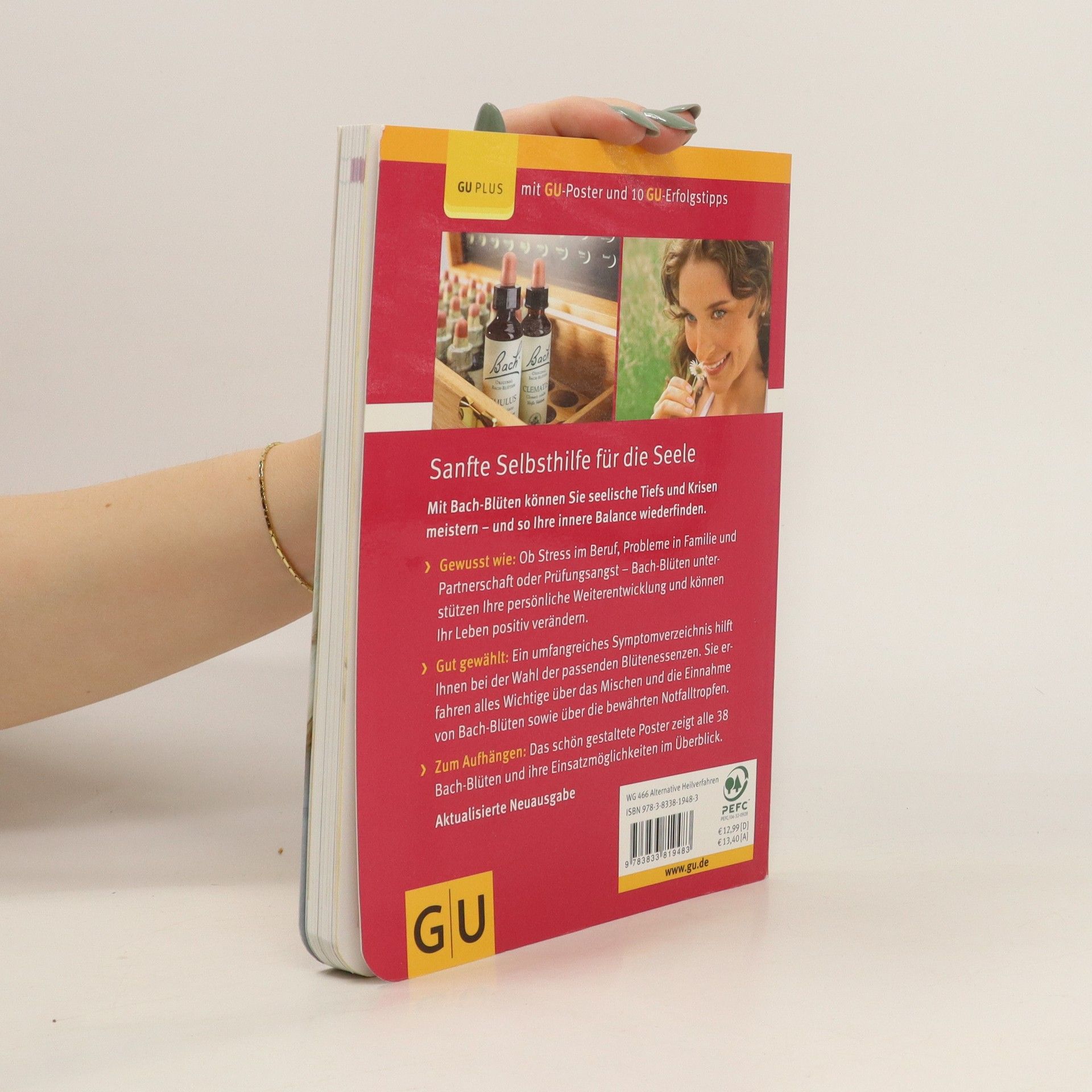 Die Bach-Blüten-Therapie wurde von dem Engländer Dr. Edward Bach um 1930 entwickelt. Sie basiert auf der Idee, dass die gebundene Energie von Blüten eine regulierende Wirkung auf das seelische Befinden des Menschen hat. Diese sanfte Naturheilmethode hilft folglich bei der Überwindung von negativen Gemüts-zuständen wie seelischen Tiefs, Erschöpfung, Unsicherheit, Ängsten und Krisen sowie Problemen in Familie und Partnerschaft und stärkt so Lebensmut und Optimismus. Aber auch bei körperlichen Beschwerden wie leichten Schnittwunden, Kopfschmerzen, Verspannungen oder Schlaflosigkeit können die 38 Blütenessenzen unterstützend eingesetzt werden. Dabei haben Bach-Blüten keine Nebenwirkungen und sind mithilfe der Selbstbefragung, bei der der Leser mehr über sich selbst und seinen momentanen Gemütszustand erfährt, einfach und gezielt anzuwenden. Das beiliegende Poster zeigt alle 38 Bach-Blüten auf einen Blick.