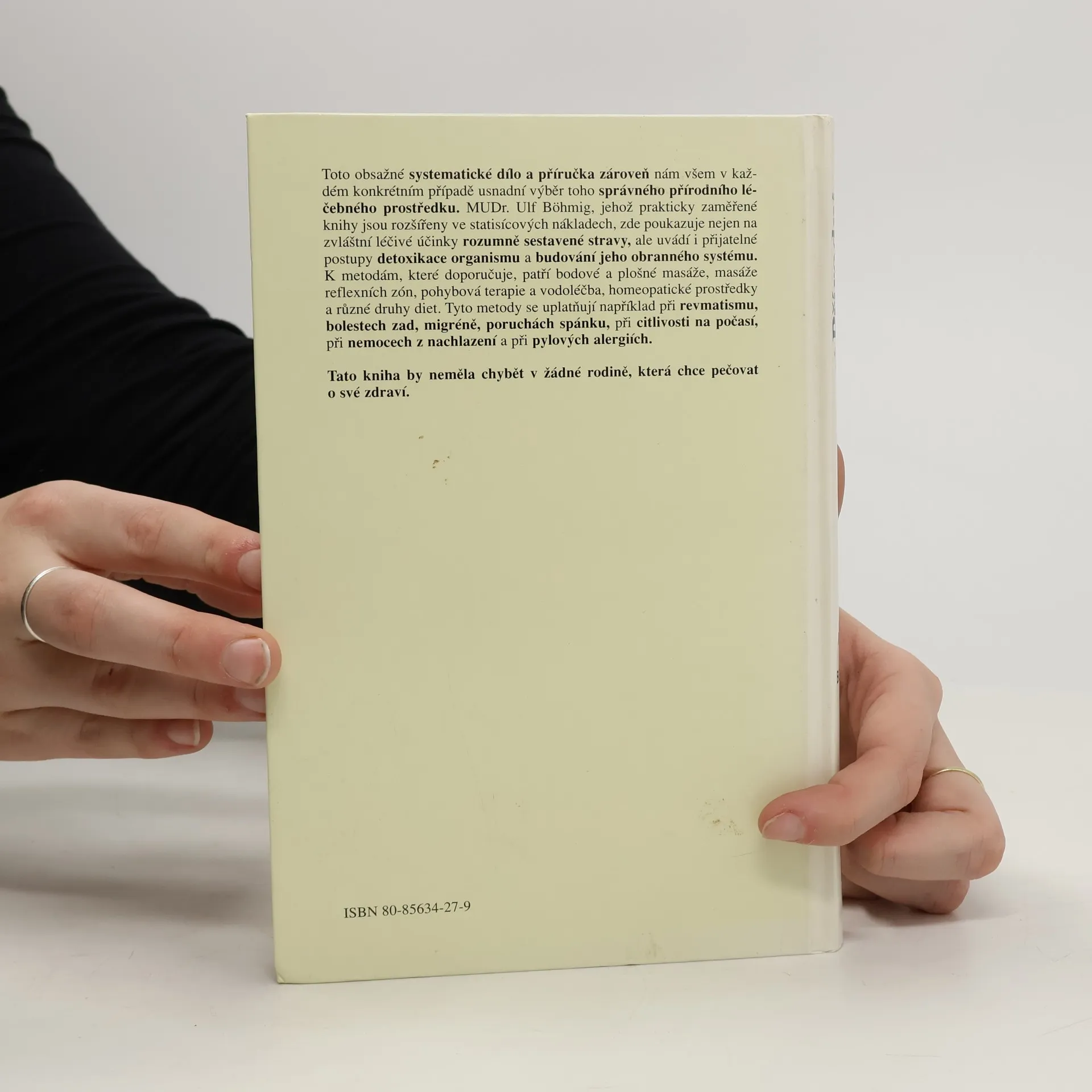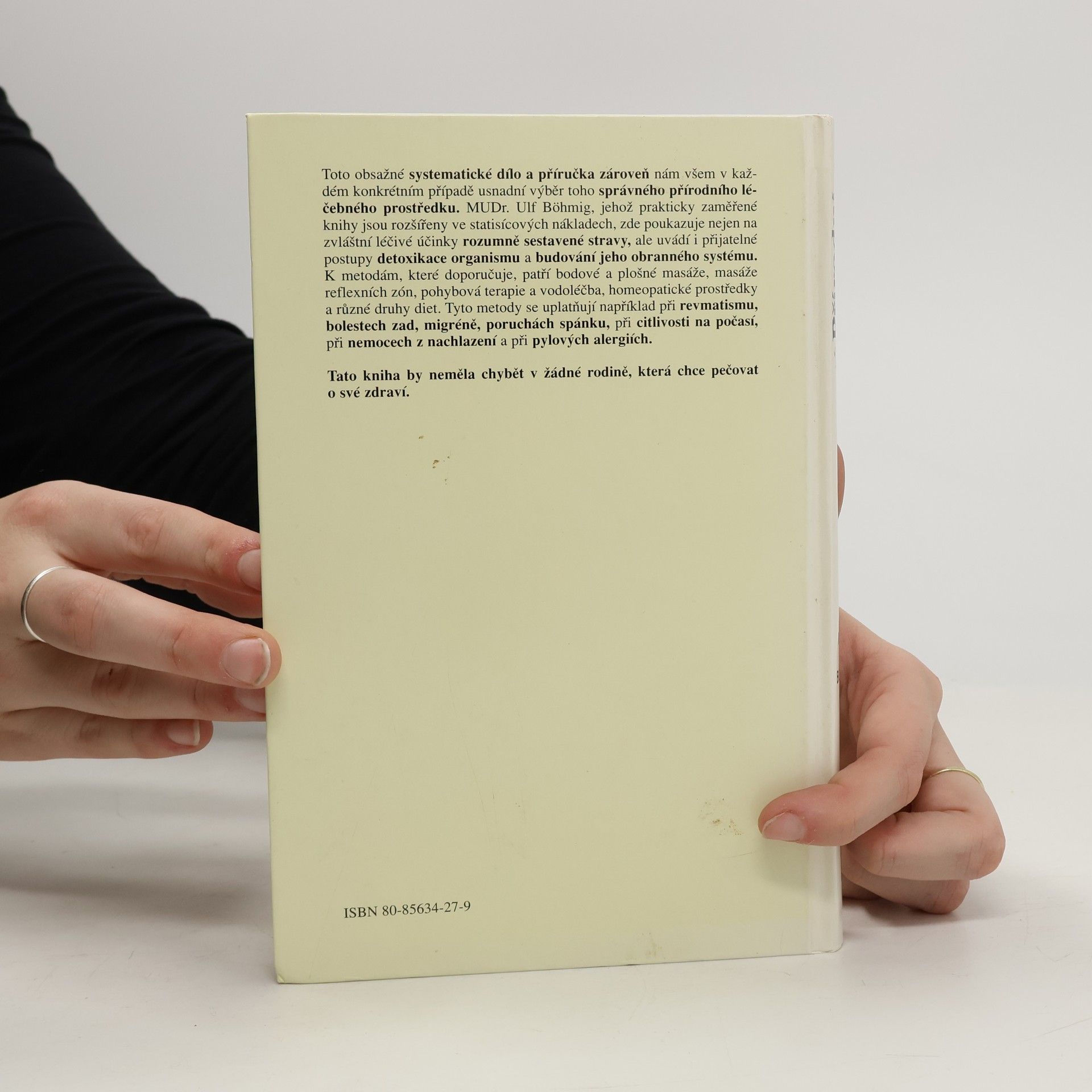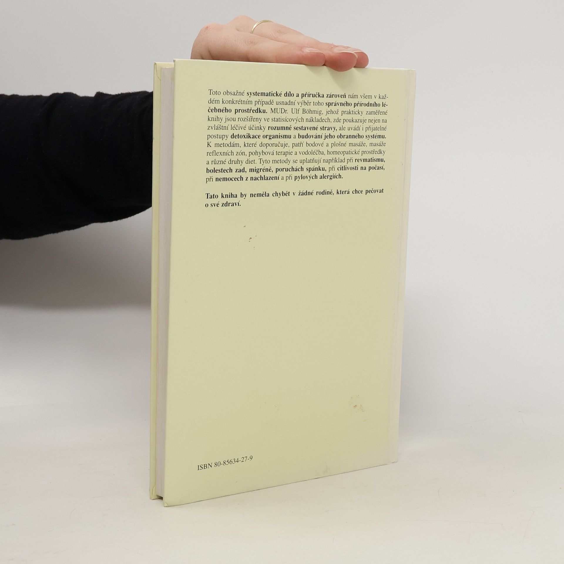 Toto obsažné systematické dílo a příručka zároveň nám všem v každém konkrétním případě usnadní výběr toho správného přírodního léčebného prostředku. MUDr. Ulf Böhmig, jehož prakticky zaměřené knihy jsou rozšířeny ve statisícových nákladech, zde poukazuje nejen na zvláštní léčivé účinky rozumně sestavené stravy, ale uvádí i přijatelné postupy detoxikace organismu a budování jeho obranného systému. K metodám, které doporučuje, patří bodové a plošné masáže, masáže reflexních zón, pohybová terapie a vodoléčba, homeopatické prostředky a různé druhy diet. Tyto metody se uplatňují například při revmatismu, bolestech zad, migréně, poruchách spánku, citlivosti na počasí, při nemocech z nachlazení a při pylových alergiích.... celý text