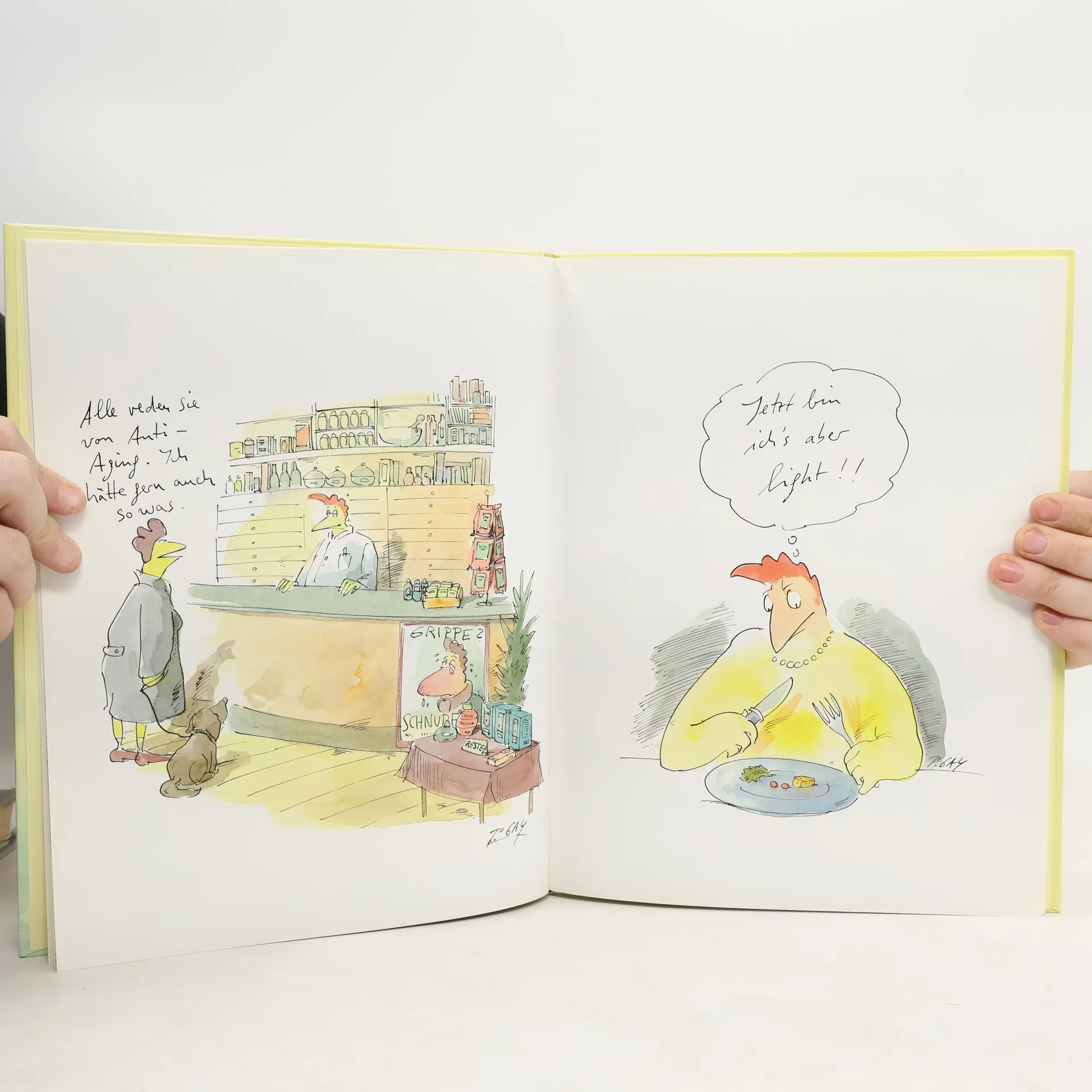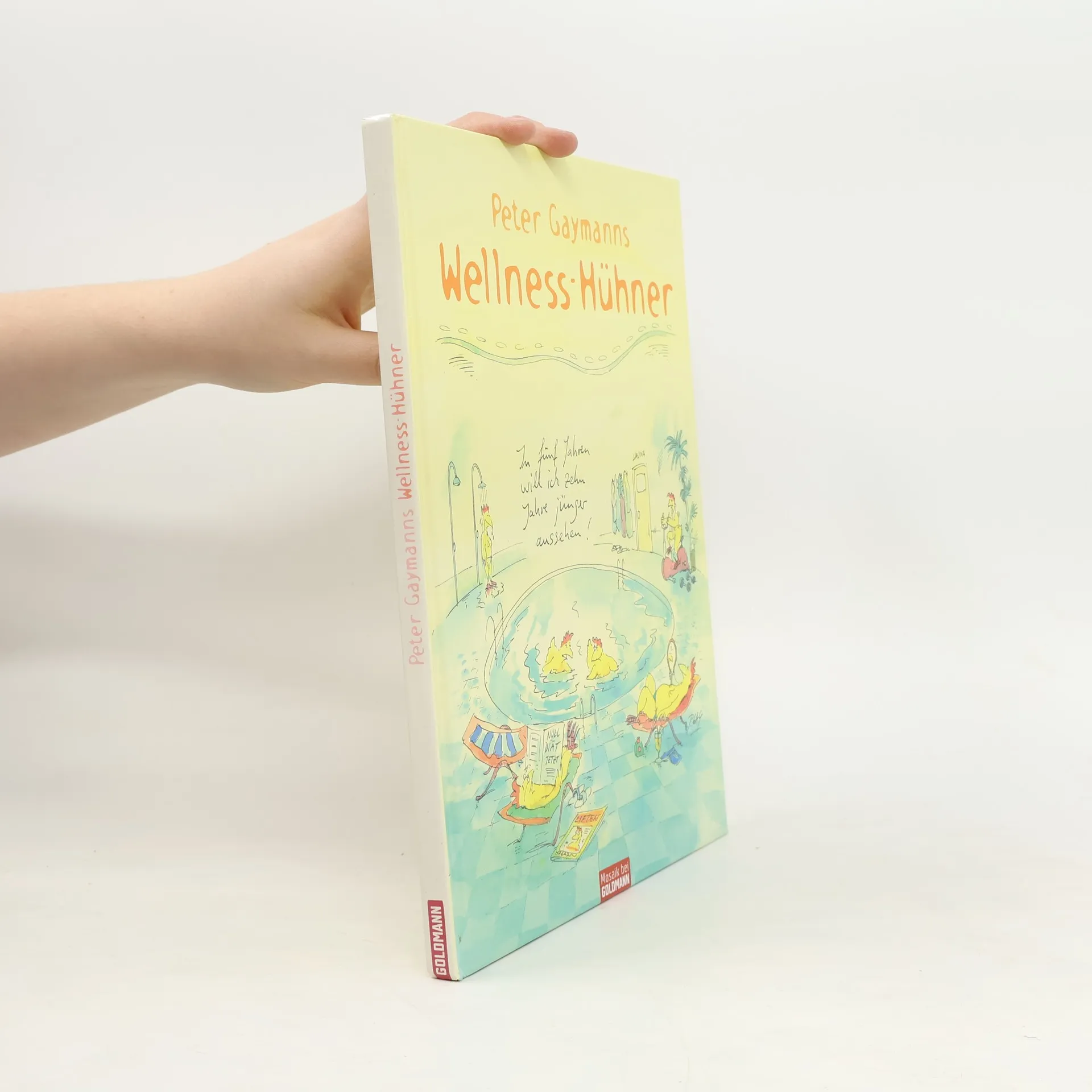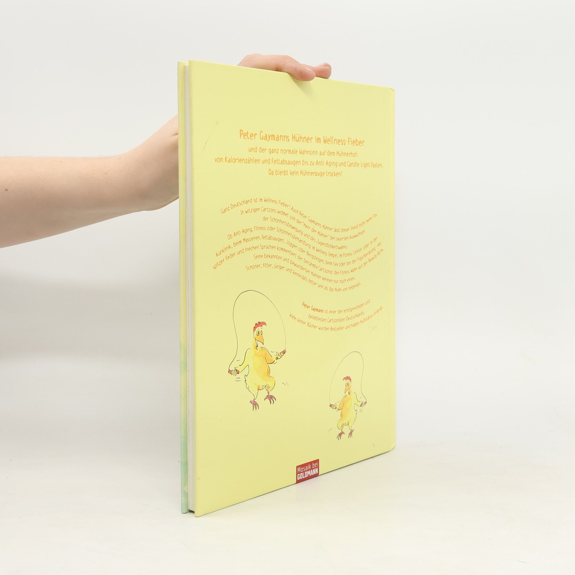 Peter Gaymanns Hühner im Wellness-Fieber – und der ganz normale Wahnsinn auf dem Hühnerhof: von Kalorienzählen und Fettabsaugen bis zu Anti-Aging und Candle-Light-Fasten. Ganz wie im richtigen Leben. Da bleibt kein Hühnerauge trocken! Ganz Deutschland ist im Wellness-Fieber! Auch Peter Gaymanns Hühner lässt dieser Trend nicht mehr los: Ob Anti-Aging, Fitness oder Schönheitsbehandlung im Wellness-Tempel, im Fitness-Center oder in der Kurklinik, beim Massieren, Fettabsaugen, Joggen oder Bergsteigen, beim Sex oder bei der Figurberatung – mit spitzer Feder und frechen Sprüchen kommentiert der bekannte Cartoonist den Fitness-Wahn auf der Beauty-Farm. Seine beliebten und bewunderten Hühner kennen nur noch eines: Schöner, fitter, jünger und keinesfalls fetter sein als das Huhn von nebenan. Ob Schönheitskuren für Haut und Federn, gesunde Ernährung für straffe Schenkel oder Ölmassagen für ein knuspriges Aussehen – in witzigen Cartoons widmet sich der „Herr der Hühner“ den skurrilen Auswüchsen der Schönheitsbewegung und des Jugendlichkeitswahns.