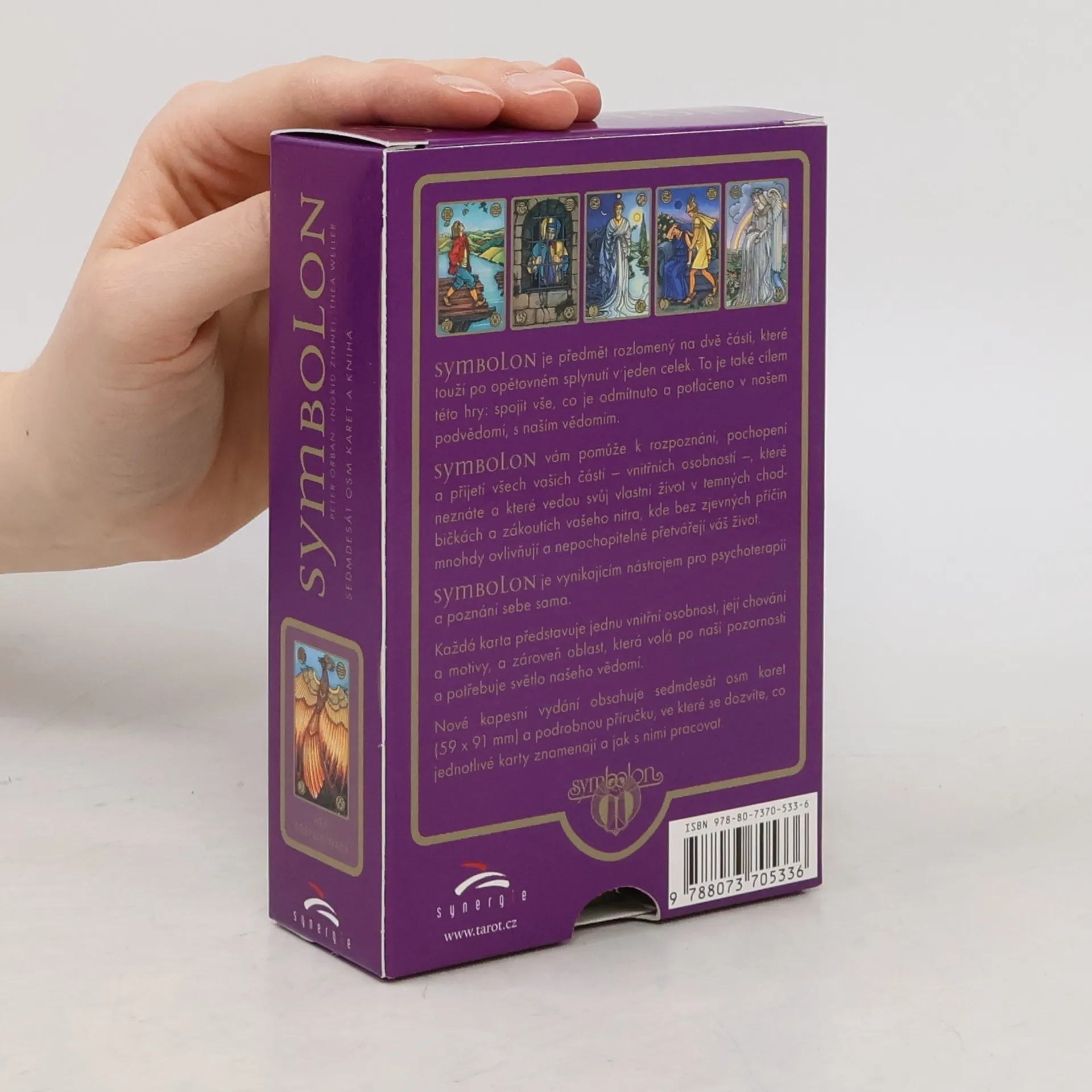 SYMBOLON je předmět rozlomený na dvě části, které touží po opětovném splynutí v jeden celek. To je také cílem této hry: spojit vše, co je odmítnuto a potlačeno v našem podvědomí, s naším vědomím. SYMBOLON vám pomůže k rozpoznání, pochopení a přijetí všech vašich částí – vnitřních osobností– které neznáte a které vedou svůj vlastní život v temných chodbičkách a zákoutích vašeho nitra, kde bez zjevných příčin mnohdy ovlivňují a nepochopitelně přetvářejí váš život. SYMBOLON je vynikajícím nástrojem pro psychoterapii a poznání sebe sama. Každá karta představuje jednu vnitřní osobnost, její chování a motivy, a zároveň oblast, která volá po naší pozornosti a potřebuje světlo našeho vědomí. Nové kapesní vydání obsahuje sedmdesát osm karet (59 x 91 mm) a podrobnou příručku, ve které se dozvíte, co jednotlivé karty znamenají a jak s nimi pracovat.