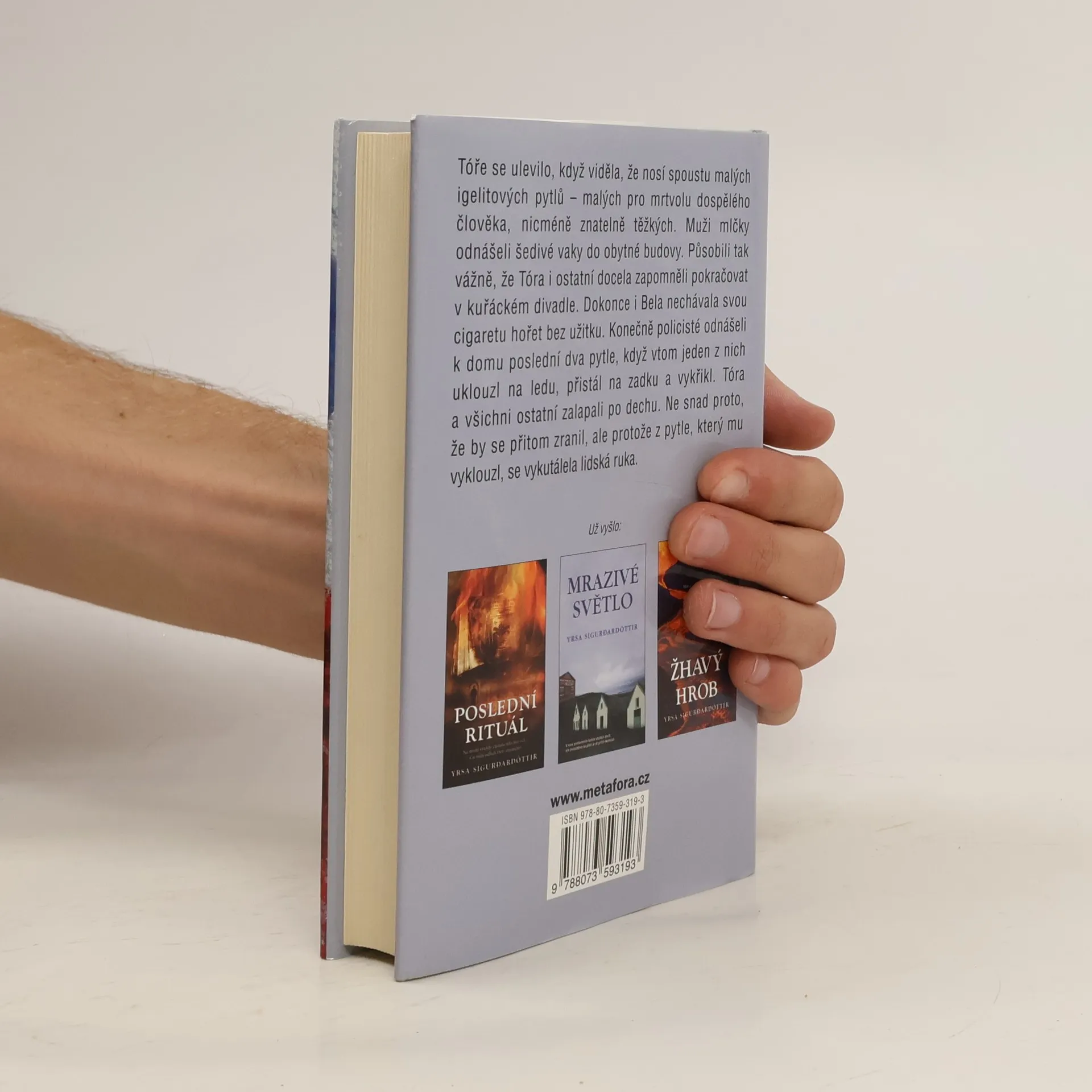 Legendy o přízracích ožívají, mrazivými pustinami Grónska se plíží smrt… Čtvrtý případ reykjavícké advokátky Tóry Gudmundsdóttir, již vyšlo Poslední rituál, Mrazivé světlo, Žhavý hrob. Advokátku Tóru Gudmundsdóttir povolají z města do ledových pustin. Pracovníci islandské společnosti, která na drsném pobřeží Grónska připravovala otevření dolu, náhle přerušili veškeré kontakty a vypadá to, jako by beze stopy zmizeli. Tóra se svým přítelem Matthiasem, svéráznou asistentkou Belou a dalšími spolupracovníky se snaží rozluštit spletité vztahy, které v táboře panovaly, a přijít tak na kloub neblahým událostem. Jako v noční můře se v zásuvkách psacích stolů objevují lidské kosti a v chladírně celá mrtvola. Náhle je těžké odlišit vrahy od obětí. Starý inuitský lovec však ví, že mstiví duchové musejí být usmířeni, a krutá ledová pustina si vždycky vybere svou daň…