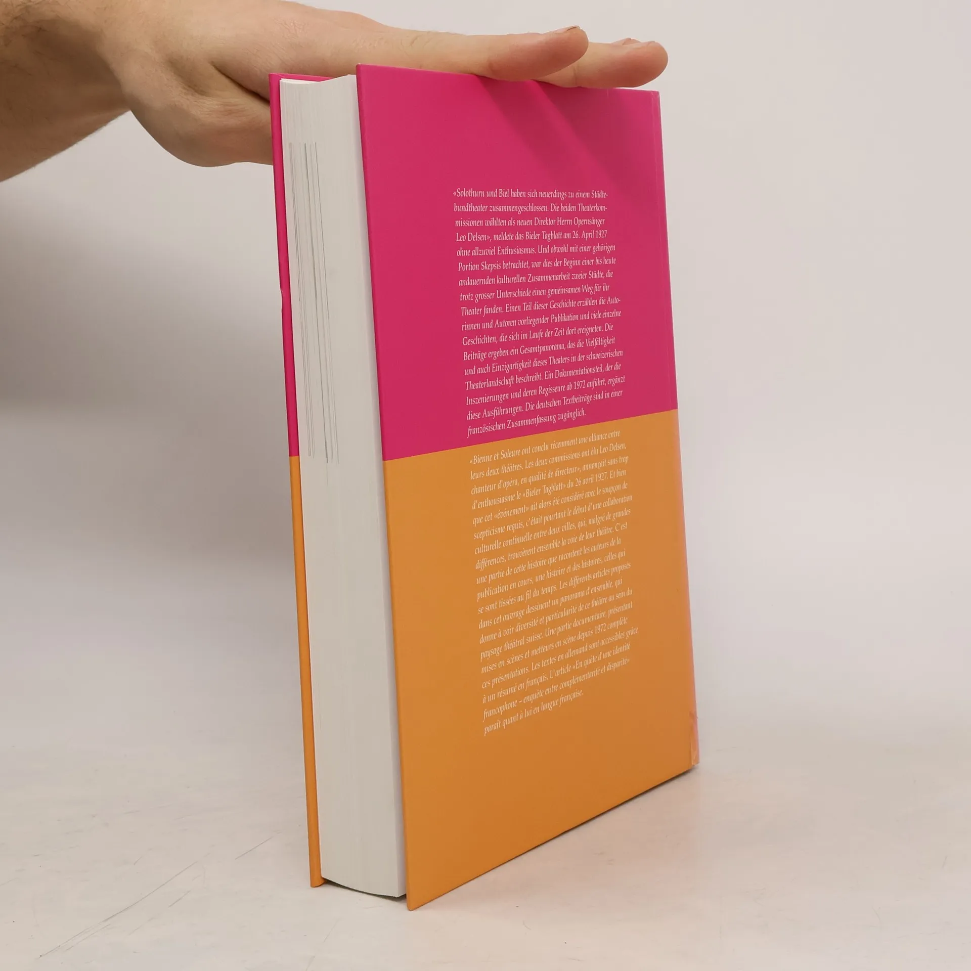 Solothurn und Biel haben sich zu einem Städtebundtheater zusammengeschlossen. Die Theaterkommissionen wählten Leo Delsen als neuen Direktor, meldete das Bieler Tagblatt am 26. April 1927. Trotz anfänglicher Skepsis begann damit eine kulturelle Zusammenarbeit zwischen zwei Städten, die, trotz ihrer Unterschiede, einen gemeinsamen Weg für ihr Theater fanden. Die Autorinnen und Autoren dieser Publikation erzählen Teile dieser Geschichte sowie zahlreiche Einzelgeschichten, die im Laufe der Zeit entstanden sind. Die Beiträge bieten ein Gesamtpanorama, das die Vielfältigkeit und Einzigartigkeit dieses Theaters in der schweizerischen Theaterlandschaft beschreibt. Ein Dokumentationsteil listet die Inszenierungen und deren Regisseure seit 1972 auf und ergänzt die Ausführungen. Die deutschen Texte sind durch französische Zusammenfassungen zugänglich. Zudem erscheint der Artikel 'En quête d'une identité francophone - enquête entre complémentarité et disparité' in französischer Sprache.