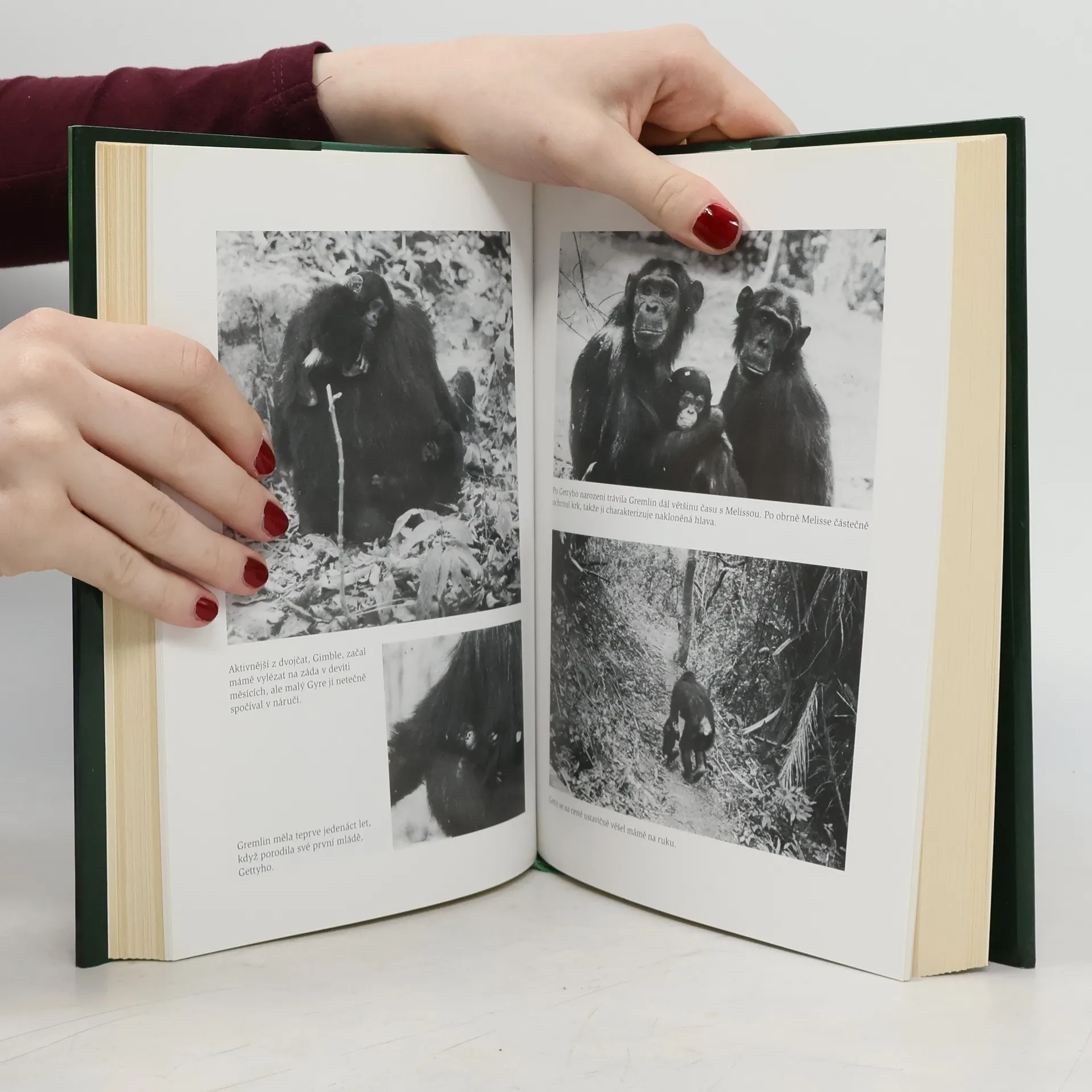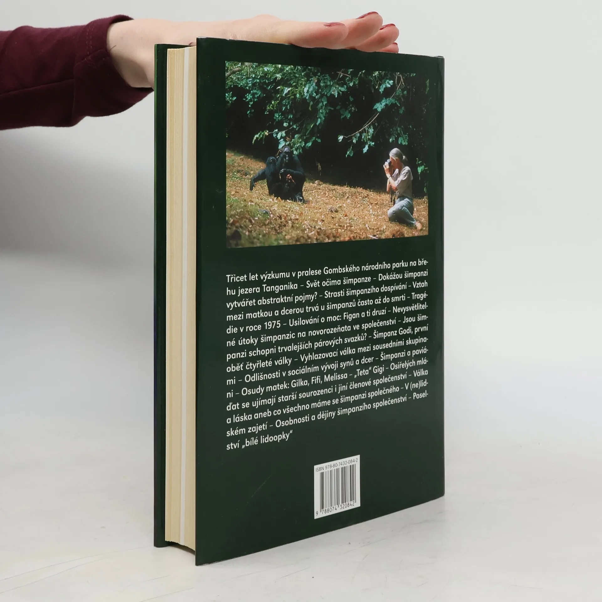 Podtitul: Třicet let se šimpanzi v rezervaci Gombe. Významná, světově proslulá etoložka se ohlíží za svým třicetiletým působením v Africe a podává ságu volně žijících šimpanzů, jejichž studiu se věnovala. Za svého dlouholetého výzkumu odkryla mnoho z jejich života, ale také ukázala, že o nich ještě stále všechno nevíme, například o jejich agresivitě, hloubce jejich starostlivosti či míře jejich vcítění. Šimpanzi, naši nejbližší příbuzní, nám ukazují naši dávnou minulost, díky nim se dozvídáme i o vlastním místě v životě.