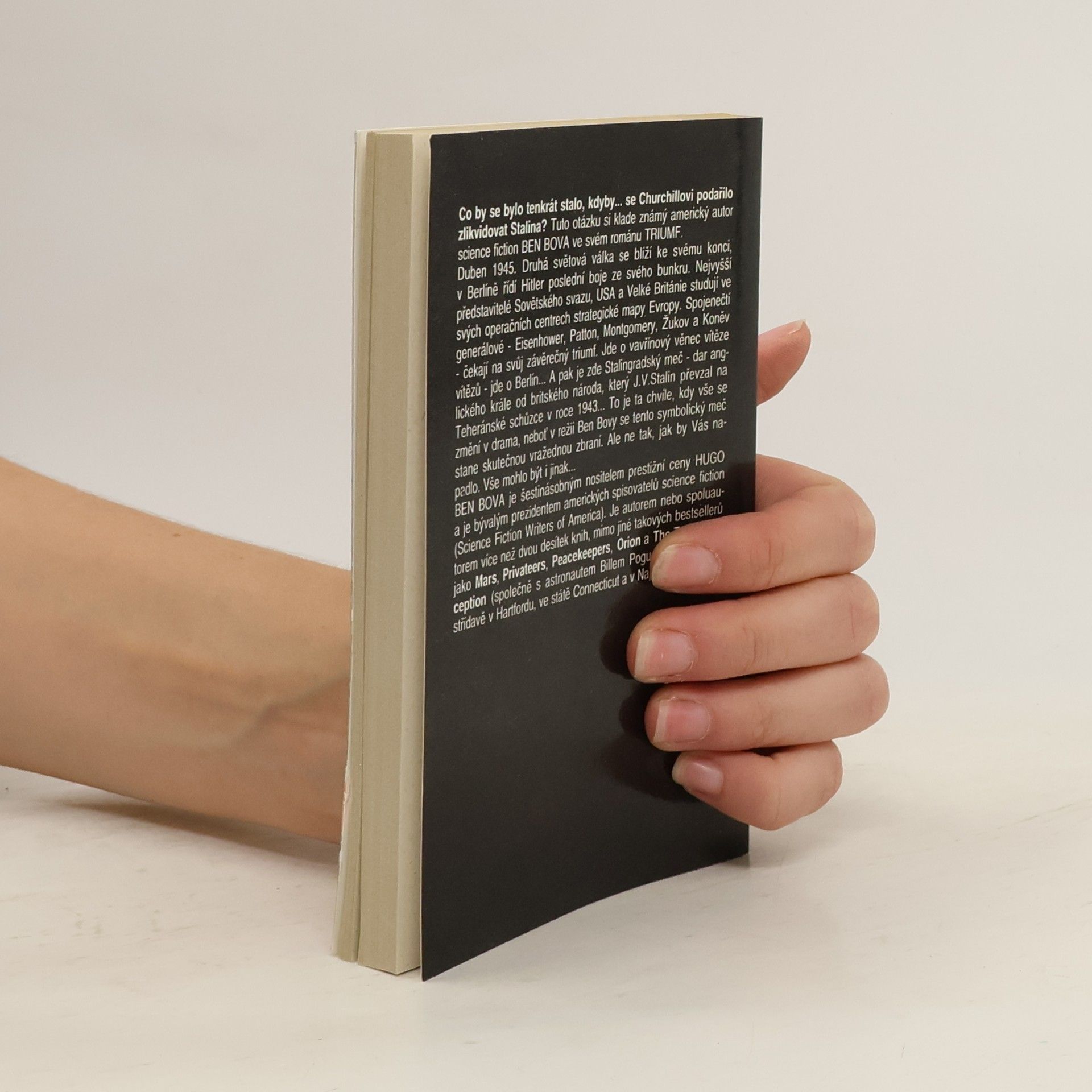Co by se bylo tenkrát stalo, kdyby… se Churchillovi podařilo zviklidovat Stalina? Tuto otázku si klade známý americký autor science fiction Ben Bova ve svém románu Triumf. Duben 1945. Druhá světová válka se blíží ke svému konci, v Berlíně řídí Hitler poslední boje ze svého bunkru. Nejvyšší představitelé Sovětského svazu, USA a Velké Británie studují ve svých operačních centrech strategické mapy Evropy. Spojenečtí generálové – Eisenhower, Patton, Montgomery, Žukov a Koněv – čekají na svůj závěrečný triumf. Jde o vavřínový věnec vítěze vítězů – jde o Berlín… A pak je zde Stalingradský meč – dar anglického krále od britského národa, který J. V. Stalin převzal na Teheránské schůzce v roce 1943… To je ta chvíle, kdy vše se změní v drama, neboť v režii Ben Bovy se tento symbolický meč stane skutečnou vražednou zbraní. Ale ne tak, jak by Vás napadlo. Vše mohlo být i jinak…... celý text
