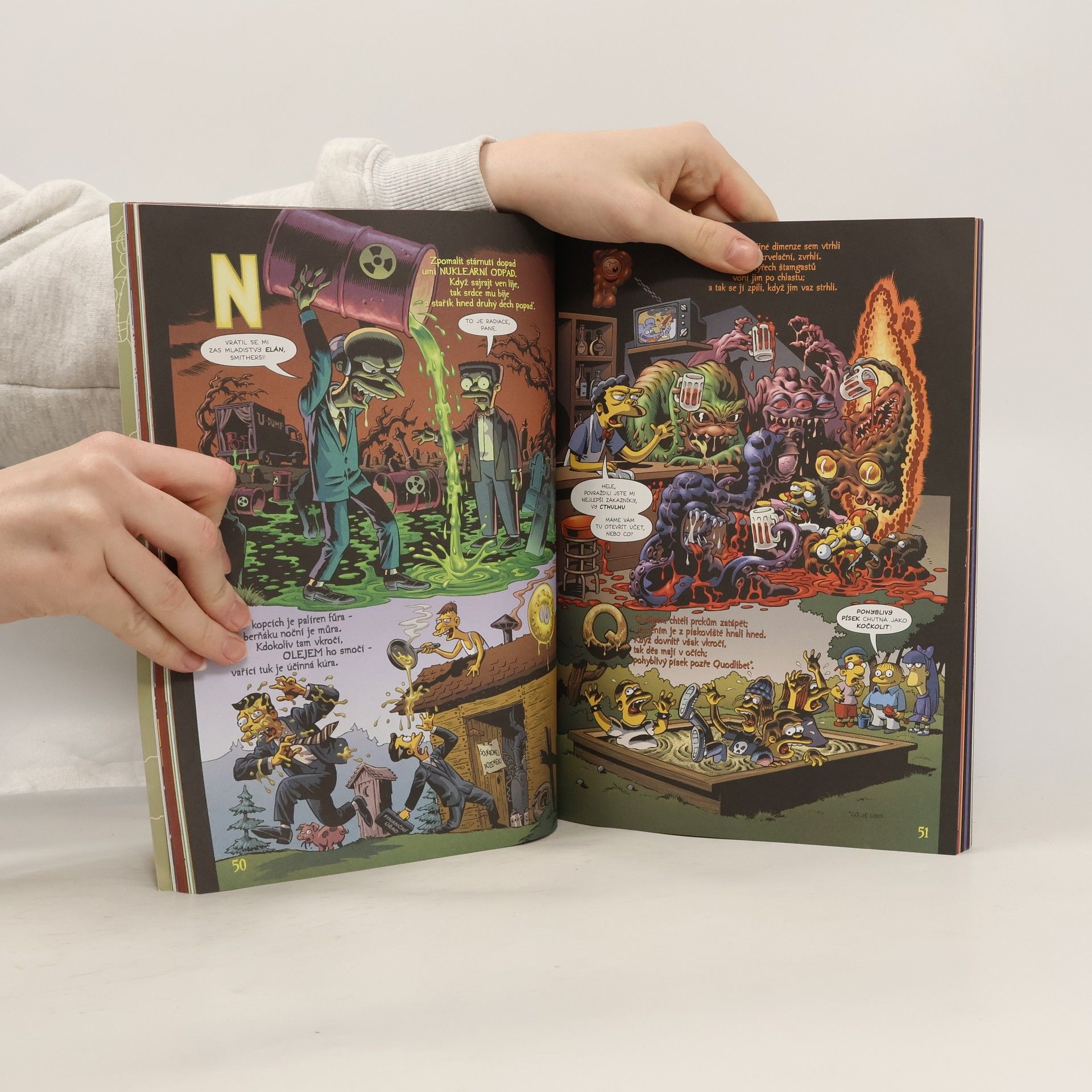 Matt Groening, vymrsknul magickou melanž, v níž najdete šílená šaškovská auta, zakleté cereálie, strašidelné špitály, závěti psané na servítkách, společenstva spjatá prstenem, upíry v sousedství a kostýmované komiksáky. Přihoďte k tomu lahev amontillada plnou pomsty a játra-rvoucí historku ze staré, dobré, krvavé Anglie a získáte příjemně plesnivý a zimničně zábavný svazek plný hrubozrnné hrůzy a halloweenské hlíny se Simpsonovými.