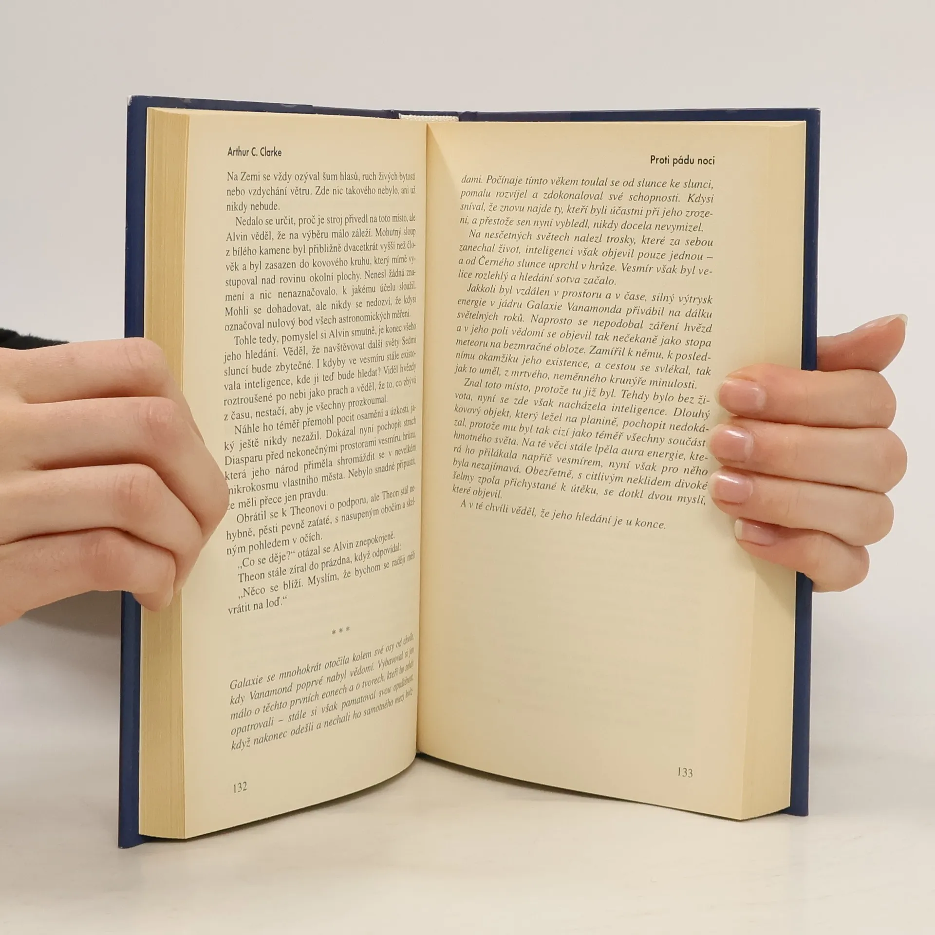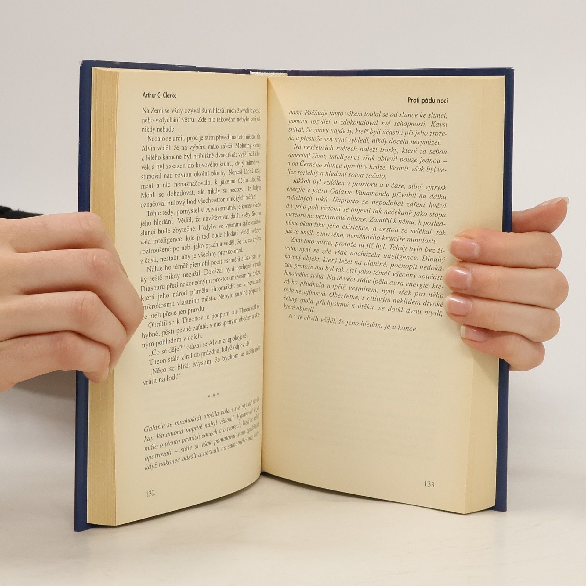 Proti pádu noci se odehrává v daleké budoucnosti ve městě Diaspar, jehož prakticky nestárnoucí obyvatelé mají k dispozici všechny vymoženosti, které lidstvo za miliony let své existence vytvořilo. Přesto se neodvažují vyjít za hranice Diasparu a prozkoumat pustinu, v níž se obrátil zbytek celé planety, natož aby obrátili oči ke hvězdám. Až mladý Alvin se vydává na cestu do neznáma. Napínavý příběh ani za několik desetiletí v ničem nezastaral a dokazuje ohromnou míru autorova talentu. Profesor astrofyziky a poradce NASA Gregory Benford je rovněž úspěšným autorem sci-fi, dokonce držitelem ceny Nebula za román Timescape. Po dohovoru s Clarkem napsal pokračování původního příběhu pod názvem Po pádu noci, v němž představuje novou Zemi, která již není pustinou, ale oplývá ohromným bohatstvím. Přesto jí hrozí smrtelné nebezpečí. -- zdroj: legie.info --