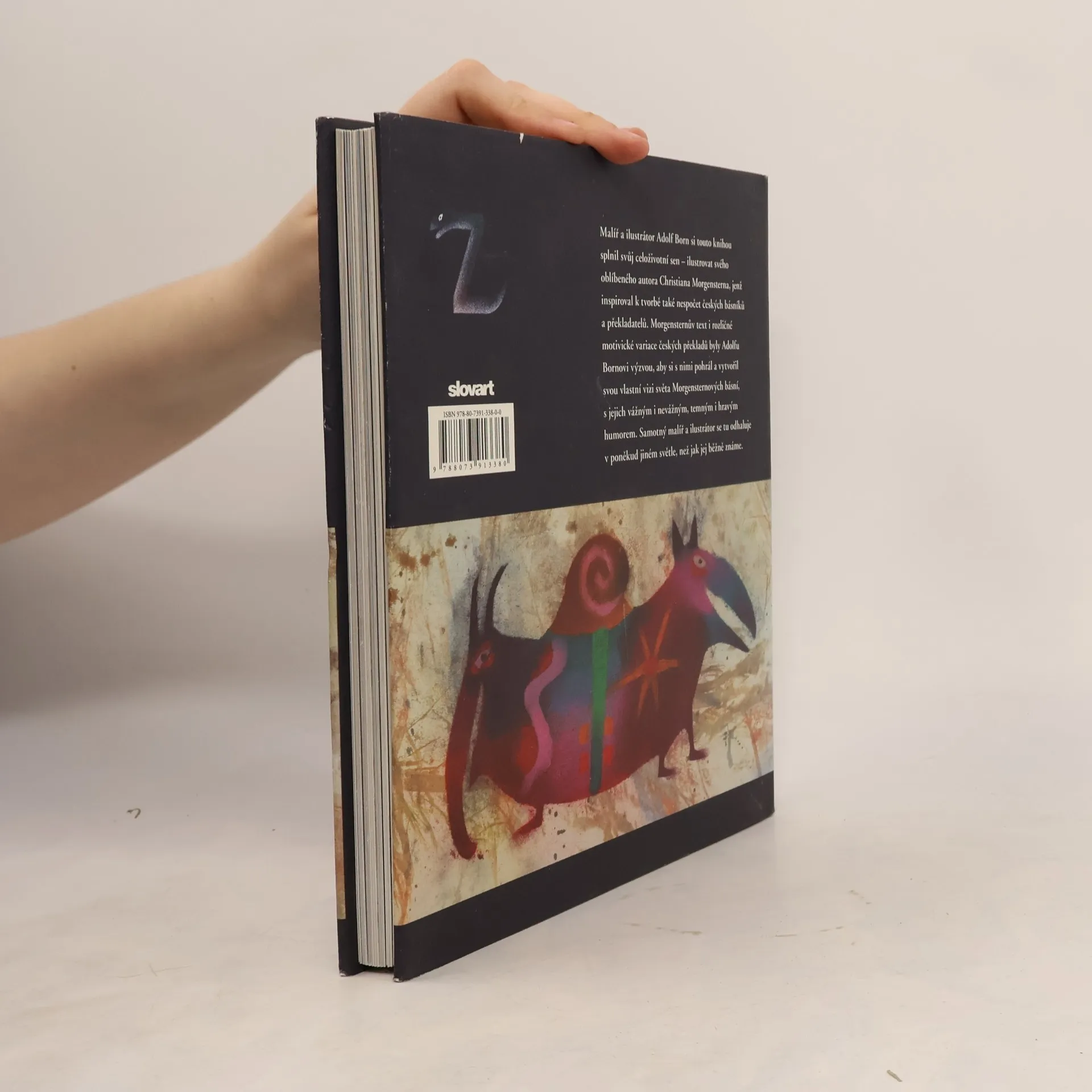 Malíř a ilustrátor Adolf Born si touto knihou splnil svůj celoživotní sen - ilustrovat svého oblíbeného autora Christiana Morgensterna, jenž inspiroval k tvorbě také nesčetné množství českých básníků a překladatelů. Rozličné motivické variace českých překladů byly Adolfovi Bornovi výzvou, aby si s nimi pohrál a vytvořil vlastní vizi světa Morgensternových básní, s jejich vážným i nevážným, temným i hravým humorem. Adolf Born se tu odkrývá v poněkud jiném světle, než jak jej zná běžný čtenář.
