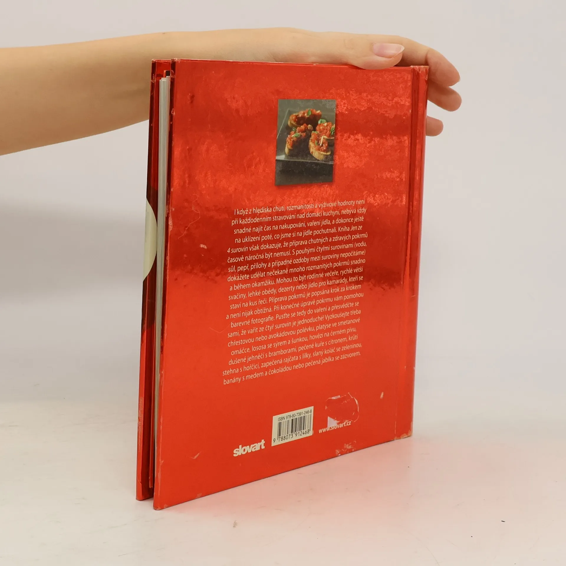 Pro mnohé z nás není vždy snadné najít čas na nakupování a vaření. Linda Doeserová však dokazuje, že příprava chutných a zdravých pokrmů nemusí být časově náročná. S pouhými čtyřmi surovinami dokážeme udělat nečekaně mnoho rozmanitých pokrmů snadno a během okamžiku. Při konečné úpravě pokrmů pomohou i inspirativní barevné fotografie. Pusťme se tedy do vaření a přesvědčme se sami, že vařit ze čtyř surovin je skutečně jednoduché! Vyzkoušíme třeba chřestovou polévku, lososa se sýrem a šunkou, hovězí na černém pivu, dušené jehněčí s bramborami, krůtí stehna s hořčicí, zapečená rajčata s lilky, slaný koláč se sýrem nebo pečená jablka se zázvorem.
