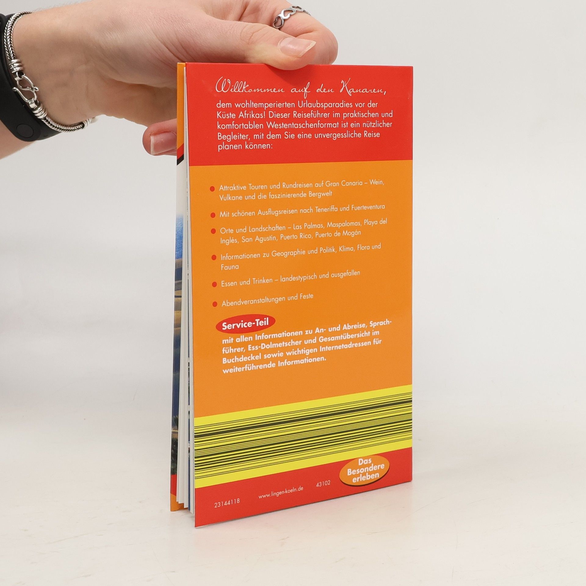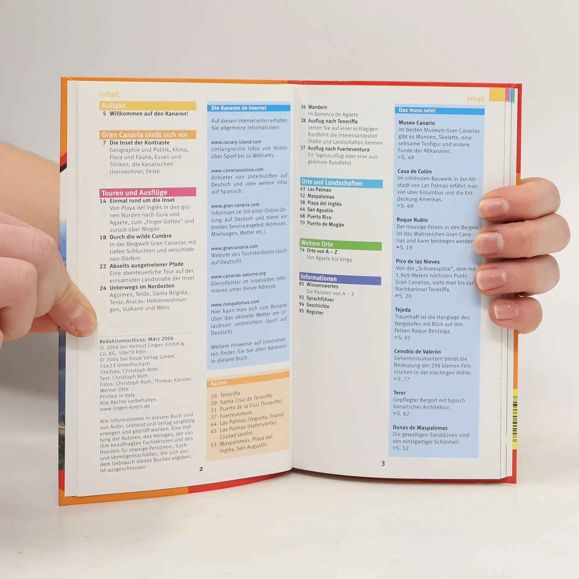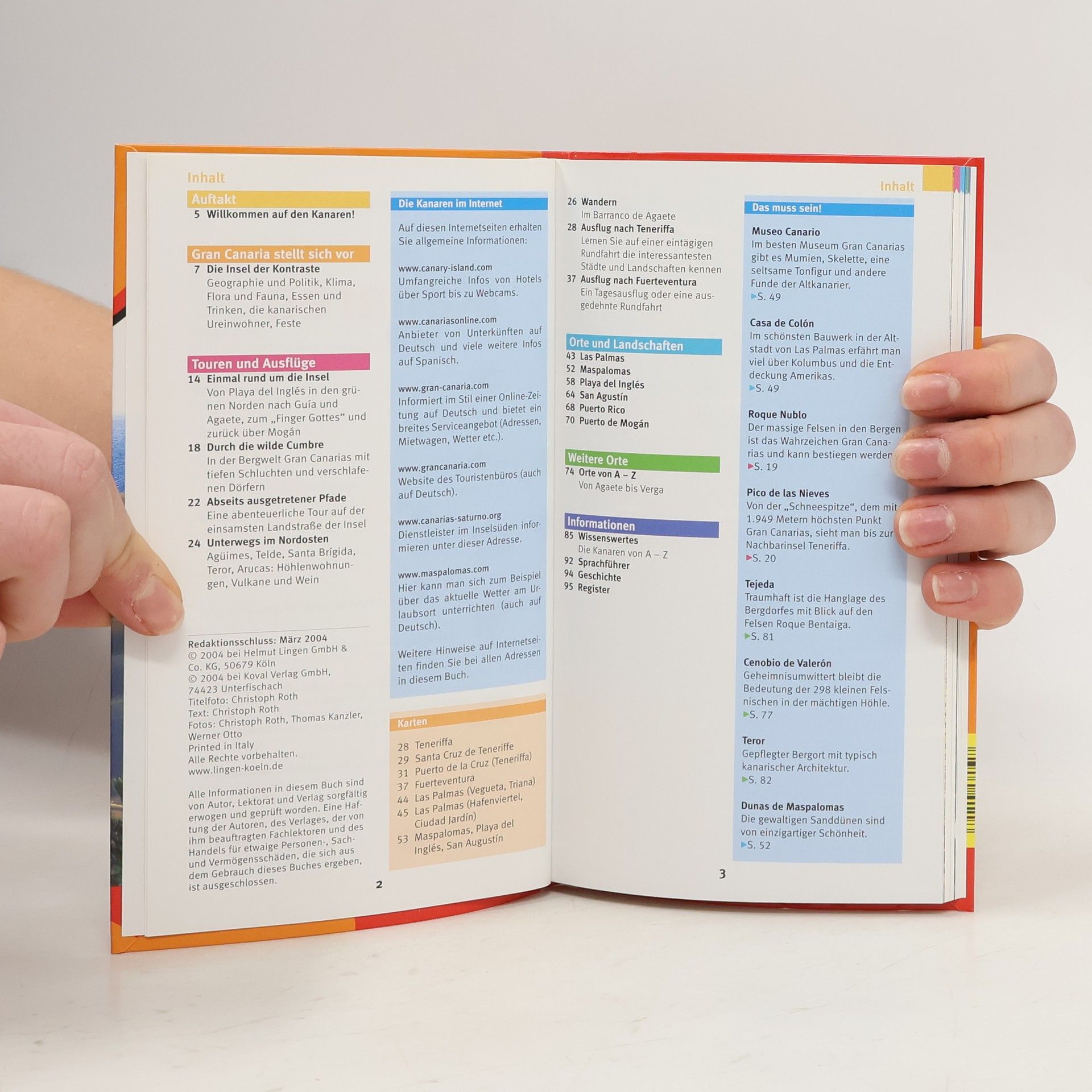 Willkommen auf den kanarischen Inseln, dem wohltemperierten Urlaubsparadies vor der Küste Afrikas! Dieser Stadtführer im praktischen und komfortablen Westentaschenformat ist ein nützlicher Begleiter, mit dem Sie eine unvergessliche Reise planen können: - Attraktive Touren und Ausflüge auf Gran Canaria – Wein, Vulkane und die faszinierende Berwelt. - Mit schönen Tagesreisen und Ausflügen nach Teneriffa und Fuerteventura. - Orte und Landschaften – Las Palmas, Maspalomas, Playa del Inglés, San Agustín, Puerto Rico, Puerto de Mogán. - Informationen zu Geographie und Politik, Klima, Flora und Fauna. - Essen und Trinken – landestypisch und ausgefallen. - Abendveranstaltungen und Feste. - Großer Service-Teil mit allen Informationen zu An- und Abreise. - Sprachführer und Ess-Dolmetscher. - Wichtige Internetadressen für weiterführende Informationen. Flexo-Broschur