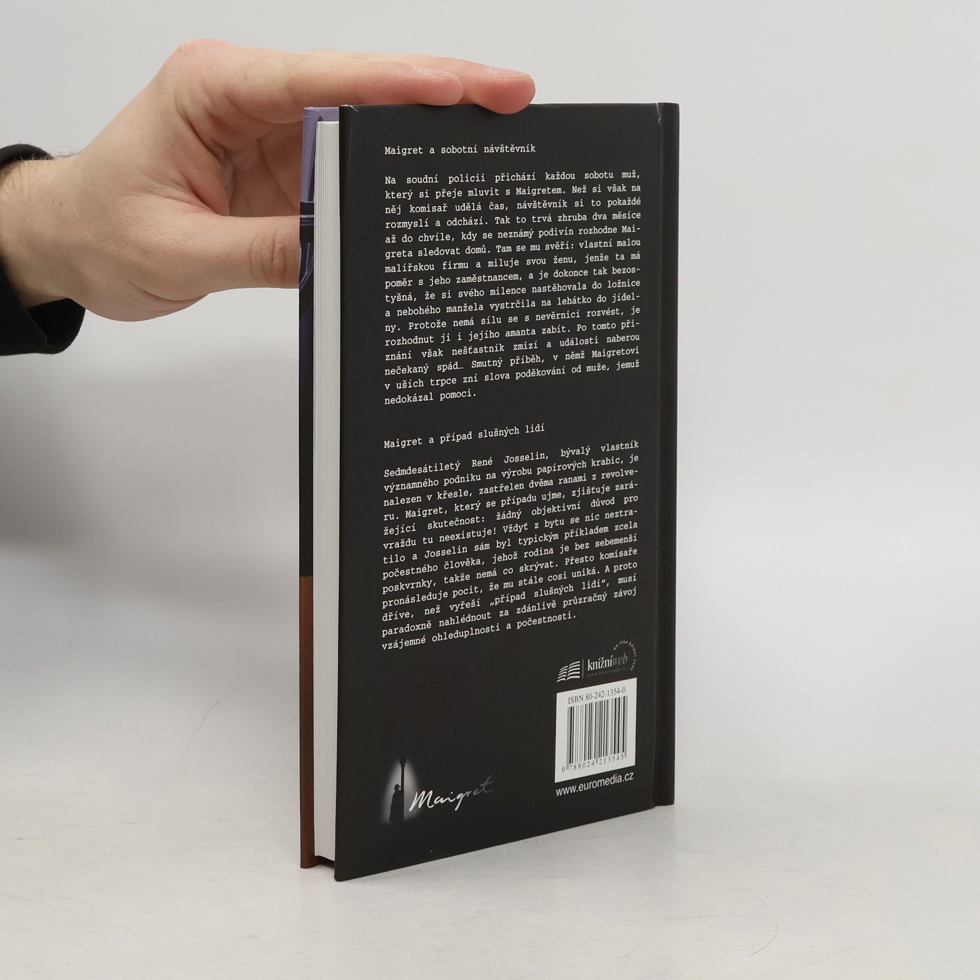 Maigret a sobotní návštěvník – Na soudní policii přichází každou sobotu muž, který si přeje mluvit s Maigretem. Než si však na něj komisař udělá čas, návštěvník si to pokaždé rozmyslí a odchází. Tak to trvá zhruba dva měsíce až do chvíle, kdy se neznámý podivín rozhodne Maigreta sledovat domů. Tam se mu svěří: vlastní malou malířskou firmu a miluje svou ženu, jenže ta má poměr s jeho zaměstnancem, a je dokonce tak bezostyšná, že si svého milence nastěhovala do ložnice a nebohého manžela vystrčila na lehátko do jídelny. Protože nemá sílu se s nevěrnicí rozvést, je rozhodnut ji i jejího amanta zabít. Po tomto přiznání však nešťastník zmizí a události naberou nečekaný spád… Smutný příběh, v němž Maigretovi v uších trpce zní slova poděkování od muže, jemuž nedokázal pomoci. Maigret a případ slušných lidí – Sedmdesátiletý René Josselin, bývalý vlastník významného podniku na výrobu papírových krabic, je nalezen v křesle, zastřelen dvěma ranami z revolveru. Maigret, který se případu ujme, zjišťuje zarážející skutečnost: žádný objektivní důvod pro vraždu tu neexistuje! Vždyť z bytu se nic neztratilo a Josselin sám byl typickým příkladem zcela počestného člověka, jehož rodina je bez sebemenší poskvrnky, takže nemá co skrývat. Přesto komisaře pronásleduje pocit, že mu stále cosi uniká. A proto dříve, než vyřeší „případ slušných lidí“, musí paradoxně nahlédnout za zdánlivě průzračný závoj vzájemné ohleduplnosti a počestnosti.
