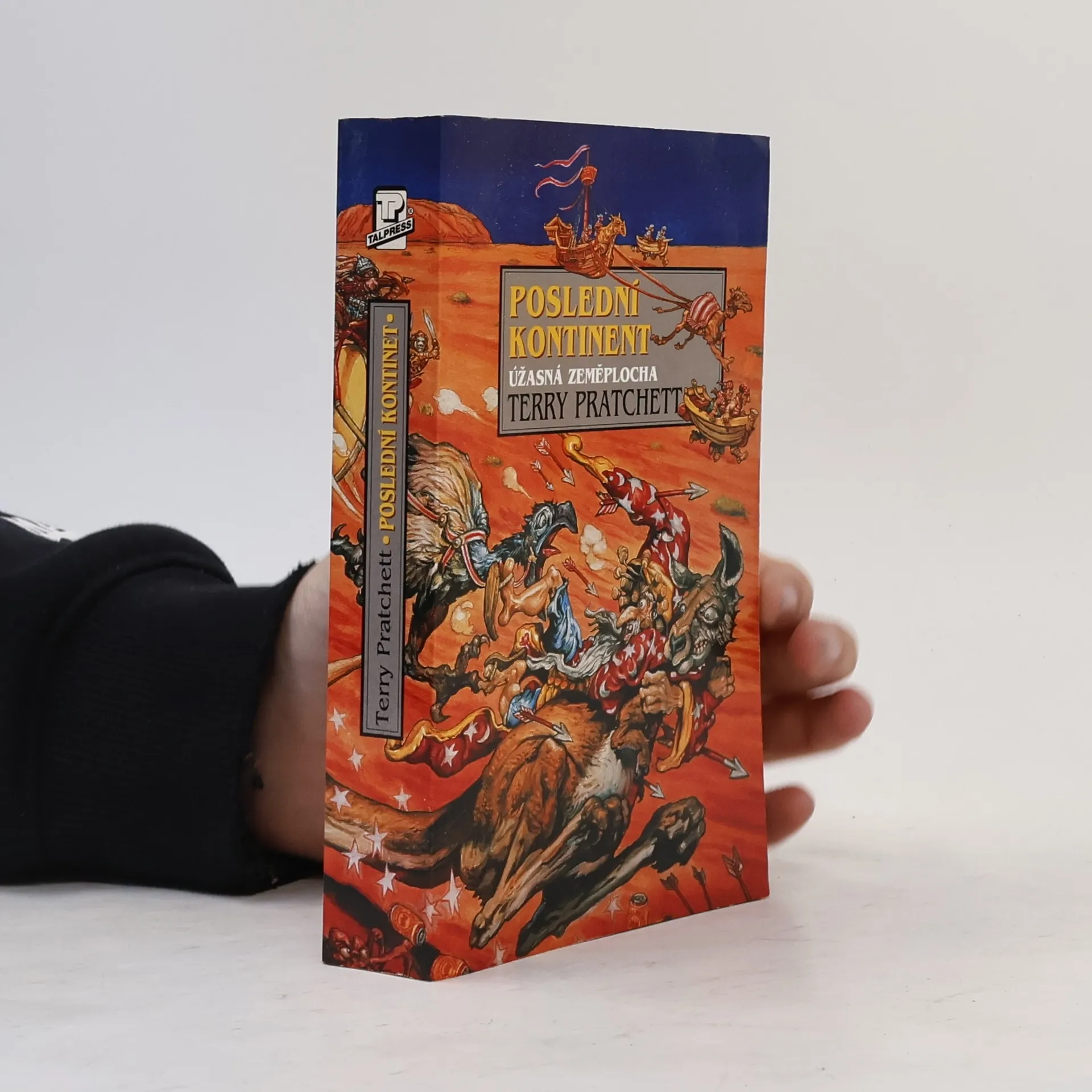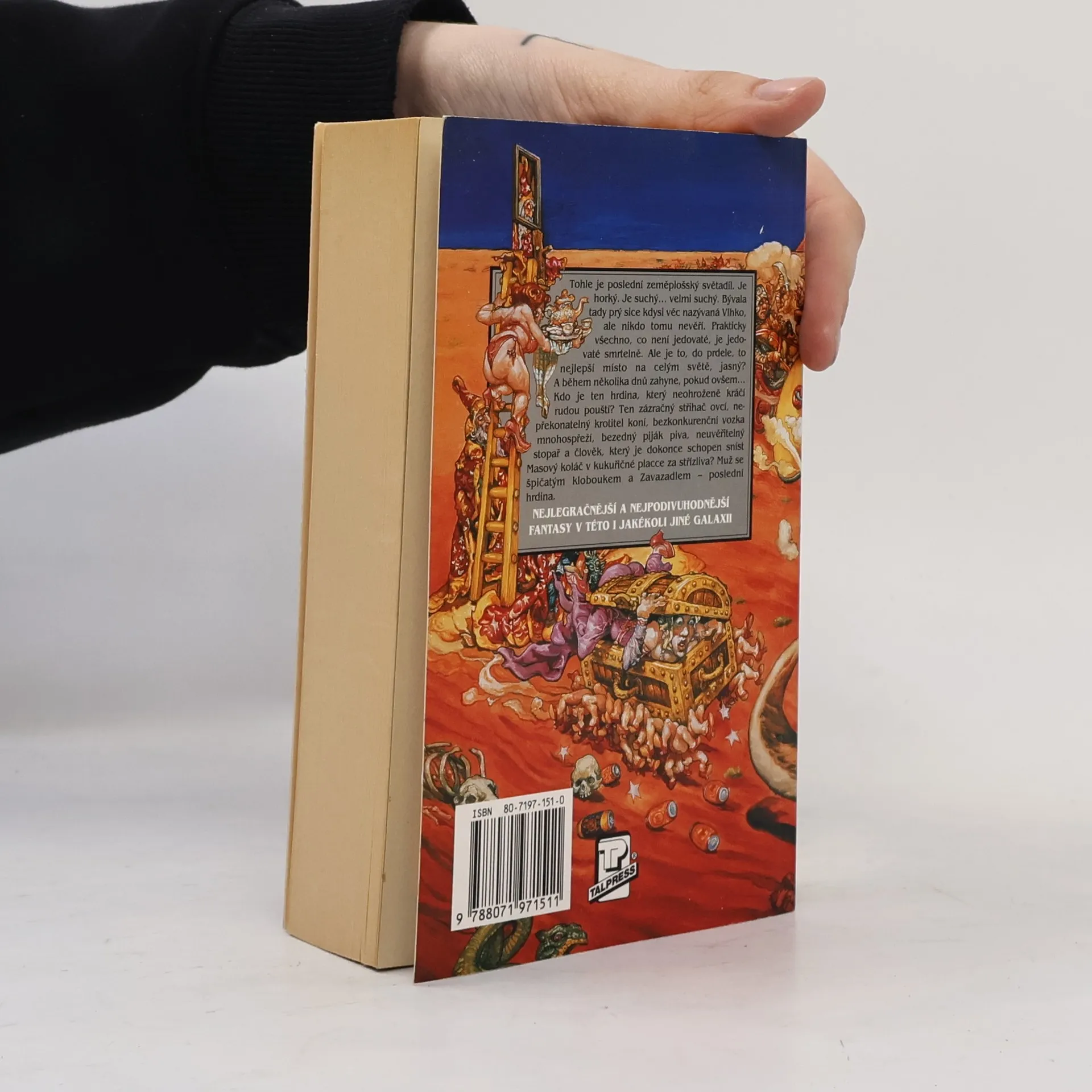 Tohle je poslední zeměplošský světadíl. Je horký. Je suchý… velmi suchý. Bývala tady prý sice kdysi věc nazývaná Vlhko, ale nikdo tomu nevěří. Prakticky všechno, co není jedovaté, je jedovaté smrtelně. Ale je to, do prdele, to nejlepší místo na celým světě, jasný? A během několika dnů zahyne, pokud ovšem… Kdo je ten hrdina, který neohroženě kráčí rudou pouští? Ten zázračný střihač ovcí, nepřekonatelný krotitel koní, bezkonkurenční vozka mnohospřeží, bezedný piják piva, neuvěřitelný stopař a člověk, který je dokonce schopen sníst Masový koláč v kukuřičné placce za střízliva? Muž se špičatým kloboukem a Zavazadlem – poslední hrdina. Úžasná Zeměplocha, kniha 22., přeložil Jan Kantůrek.